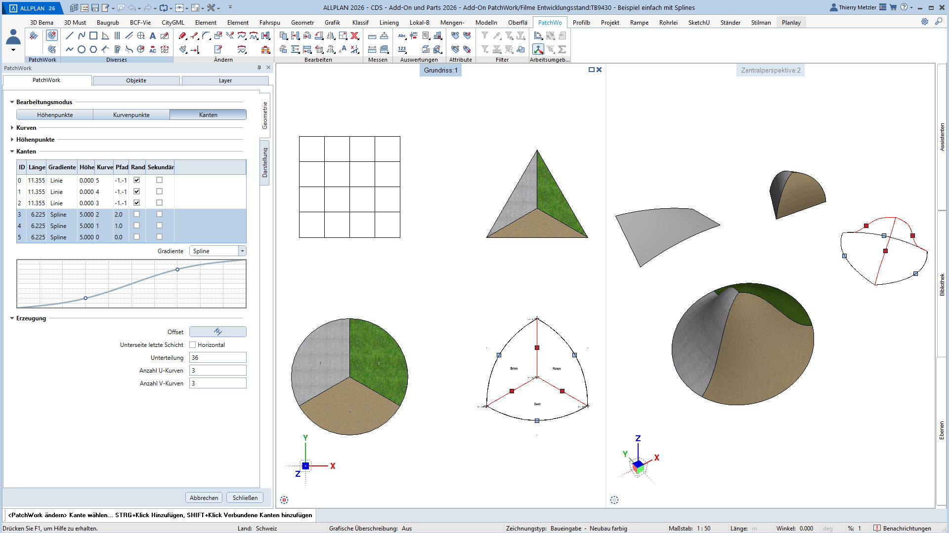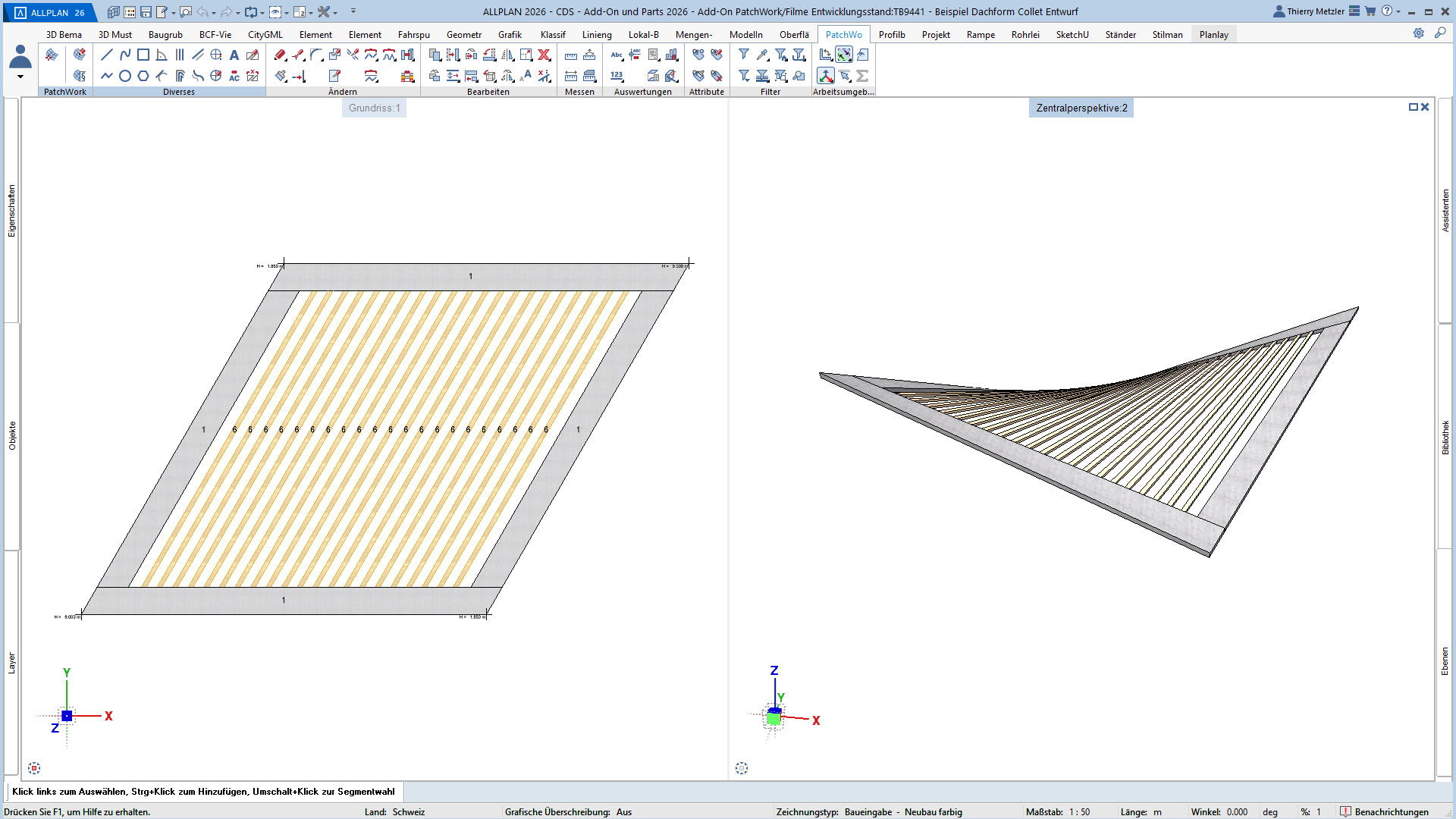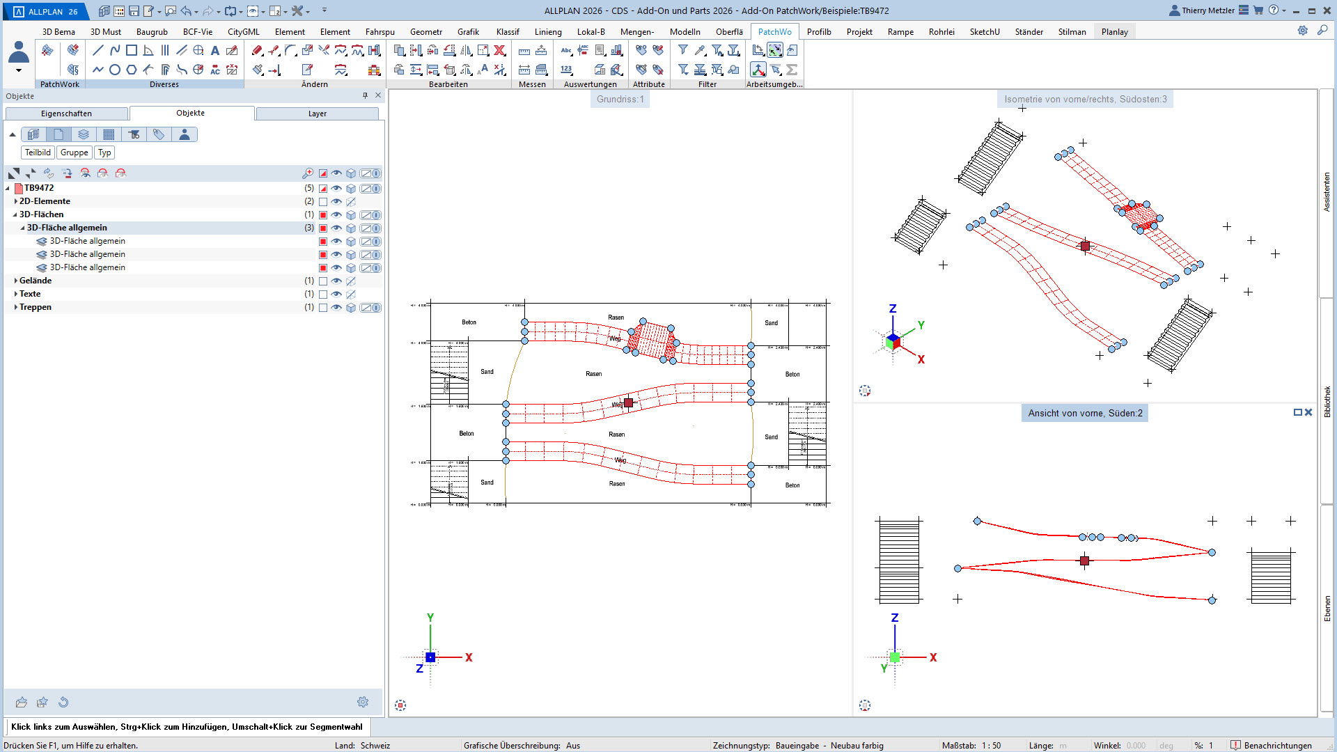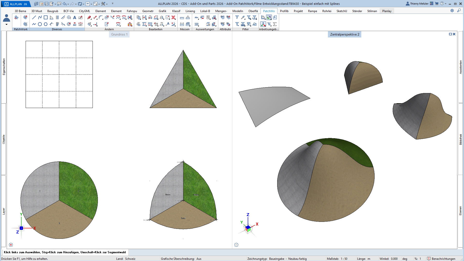 Mit dem ALLPLAN Add-On PatchWork erstellen Sie parametrische 2D- und 3D-Geometrien – intuitiv, flexibel und effizient. Egal, ob Sie 2D-Grundrisse entwerfen, komplexe 3D-Freiformbauteile wie Tragwerksstürze und Dächer modellieren oder Umgebungs- und Freiraumplanungen um Ihr Bauvorhaben umsetzen: PatchWork integriert sich nahtlos in Ihren Workflow.