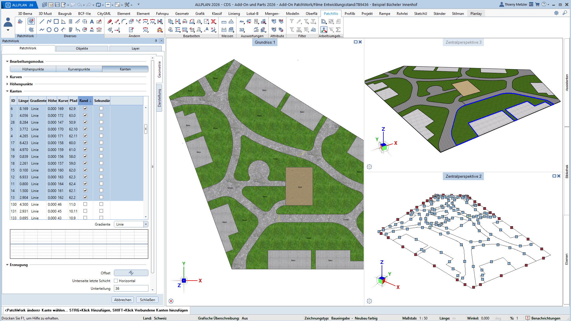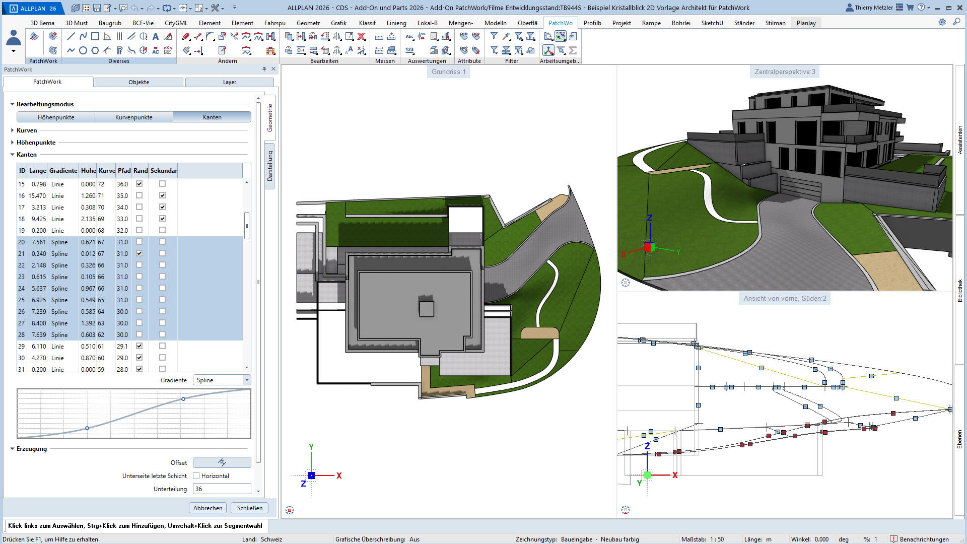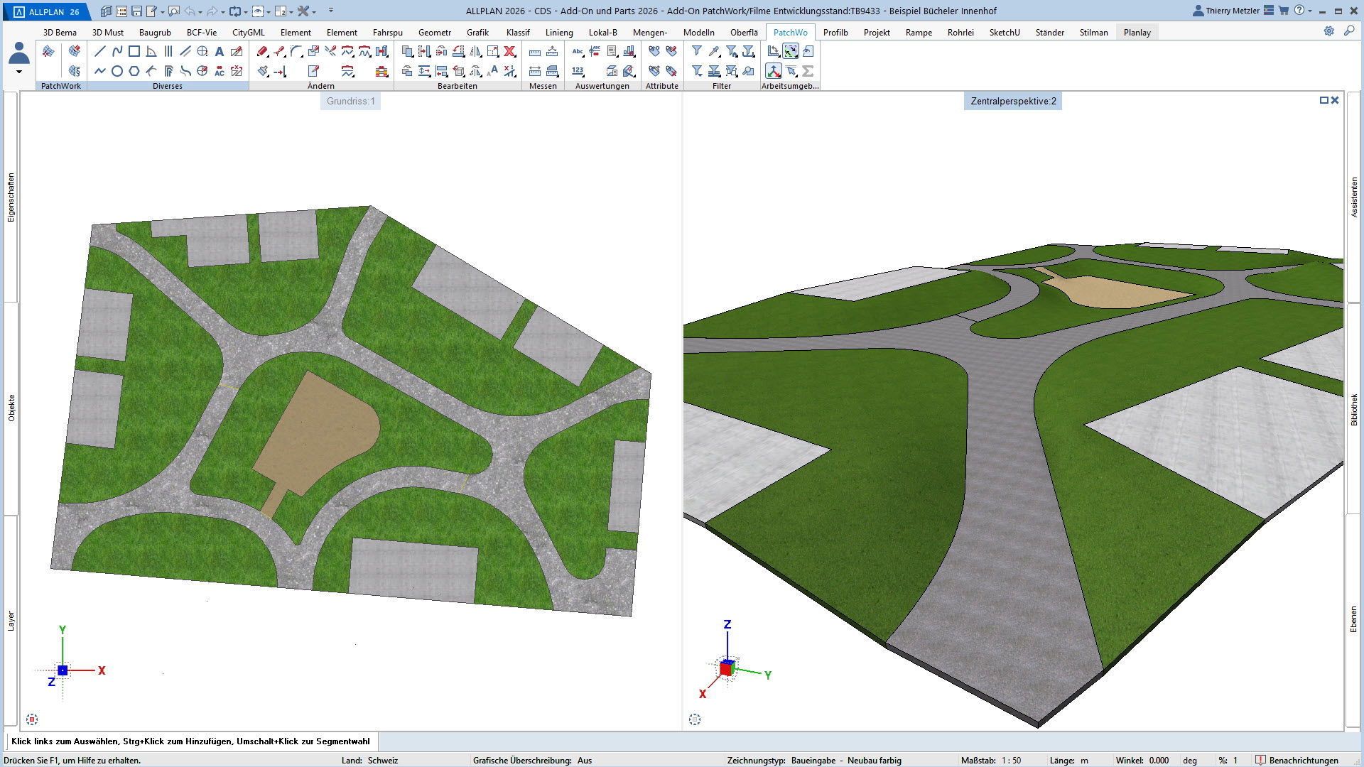 Mit dem ALLPLAN Add-On PatchWork erstellen Sie parametrische 2D- und 3D-Geometrien – intuitiv, flexibel und effizient. Egal, ob Sie 2D-Grundrisse entwerfen, komplexe 3D-Freiformbauteile wie Tragwerksstürze und Dächer modellieren oder Umgebungs- und Freiraumplanungen um Ihr Bauvorhaben umsetzen: PatchWork integriert sich nahtlos in Ihren Workflow.