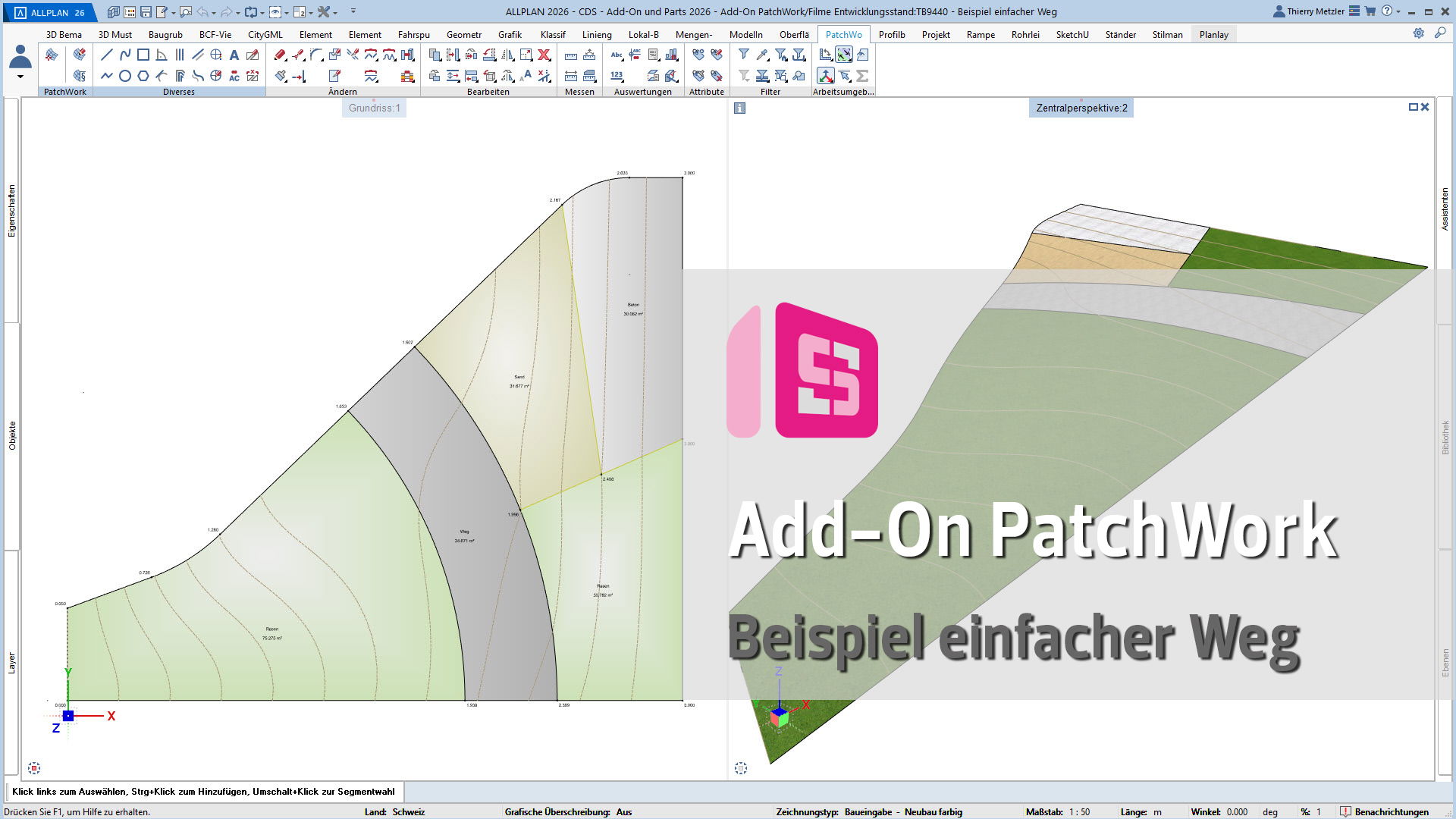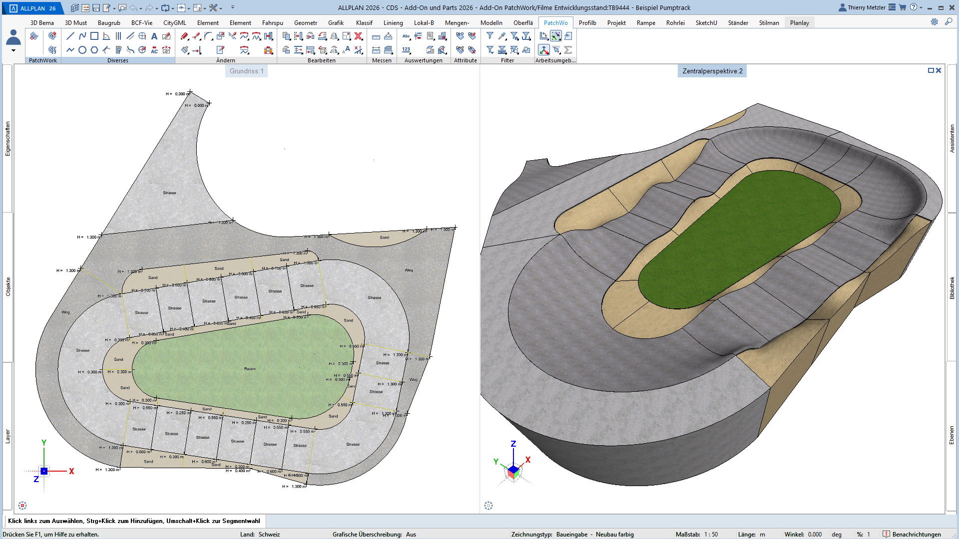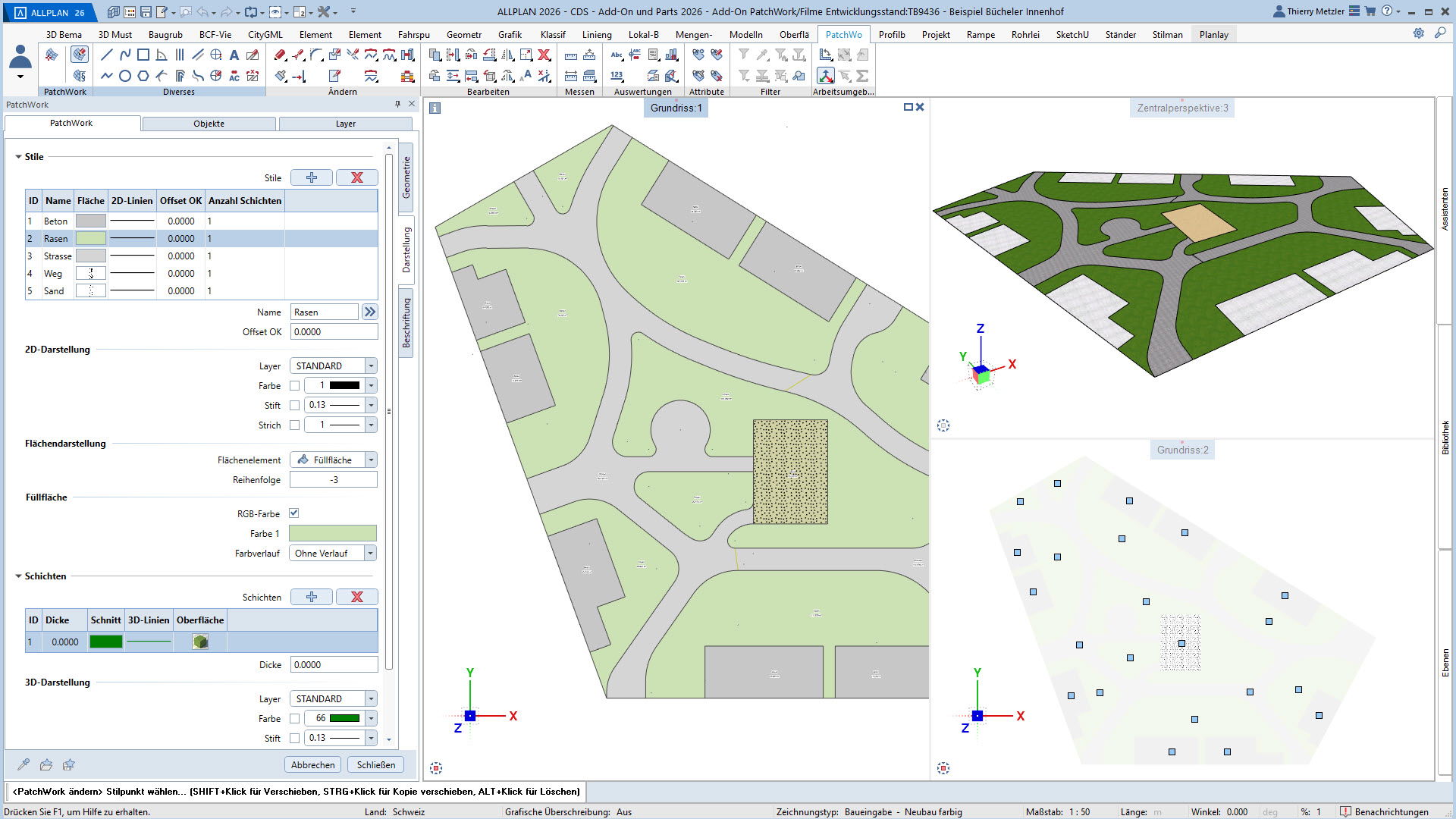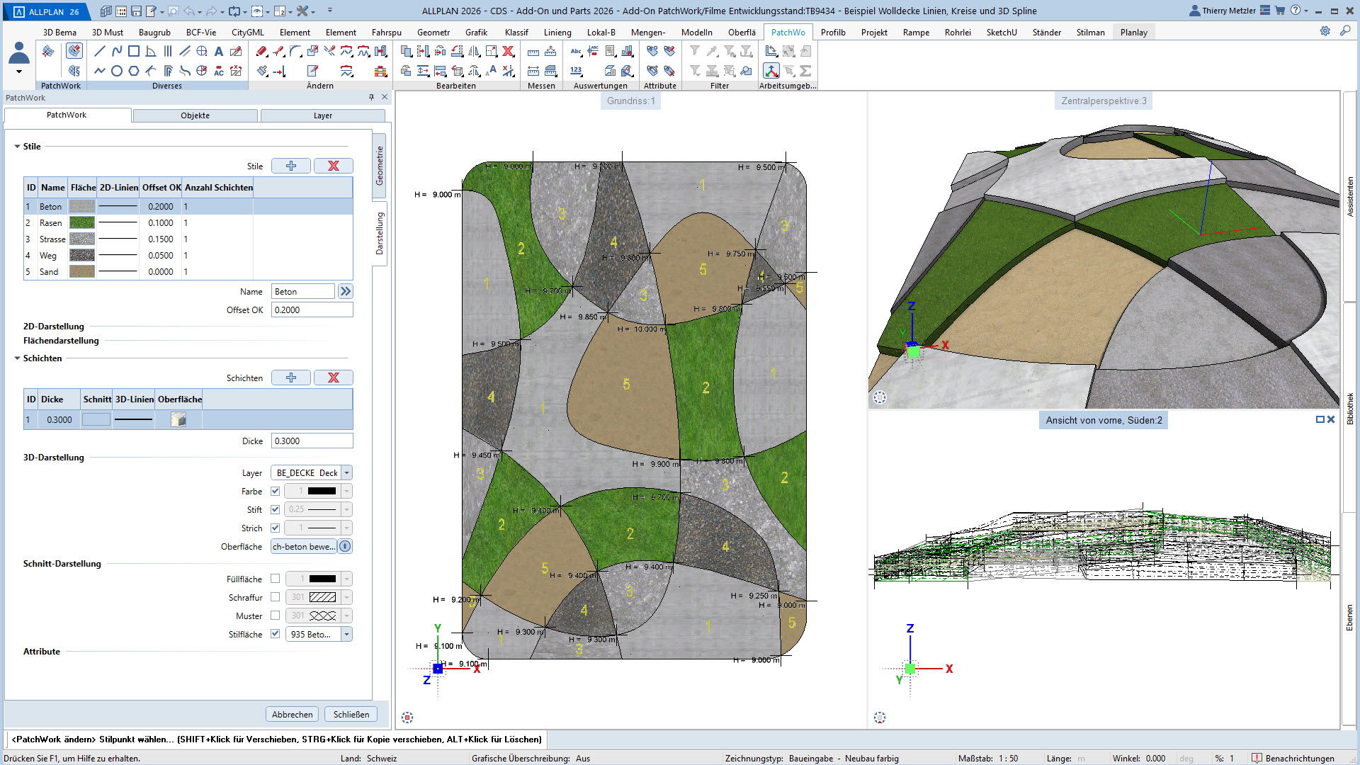 Der innovative Workflow ermöglicht die Geometrieerzeugung durch Punkte, Linien, Kreise, Splines und Kurven. In einem zweiten Schritt platzieren Sie Höhenpunkte an Eck- und Schnittpunkten, definieren Bereiche und weisen diesen verschiedene Materialstile zu – zum Beispiel Asphalt, Beton, Platten, Sand oder Rasen. PatchWork generiert daraus perfekte 2D-Darstellungen und 3D-Volumen, die aus mehreren Materialschichten bestehen können.