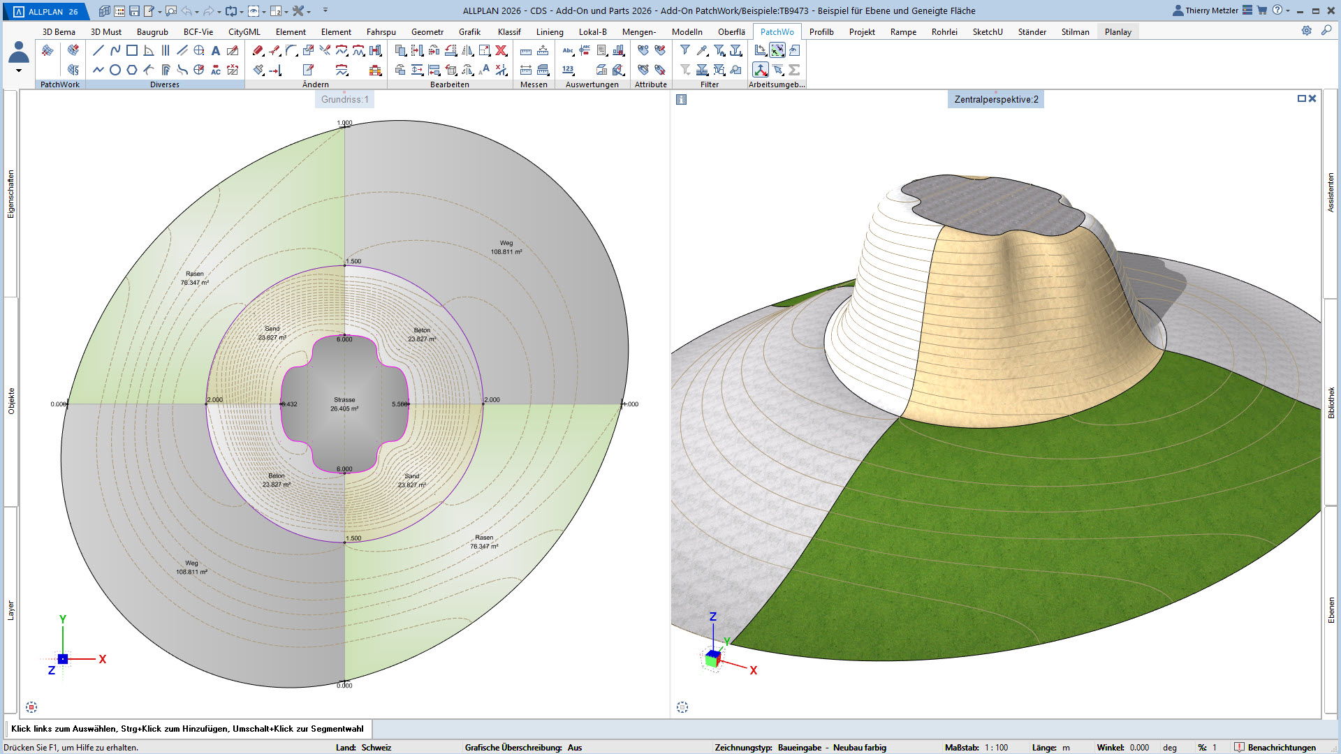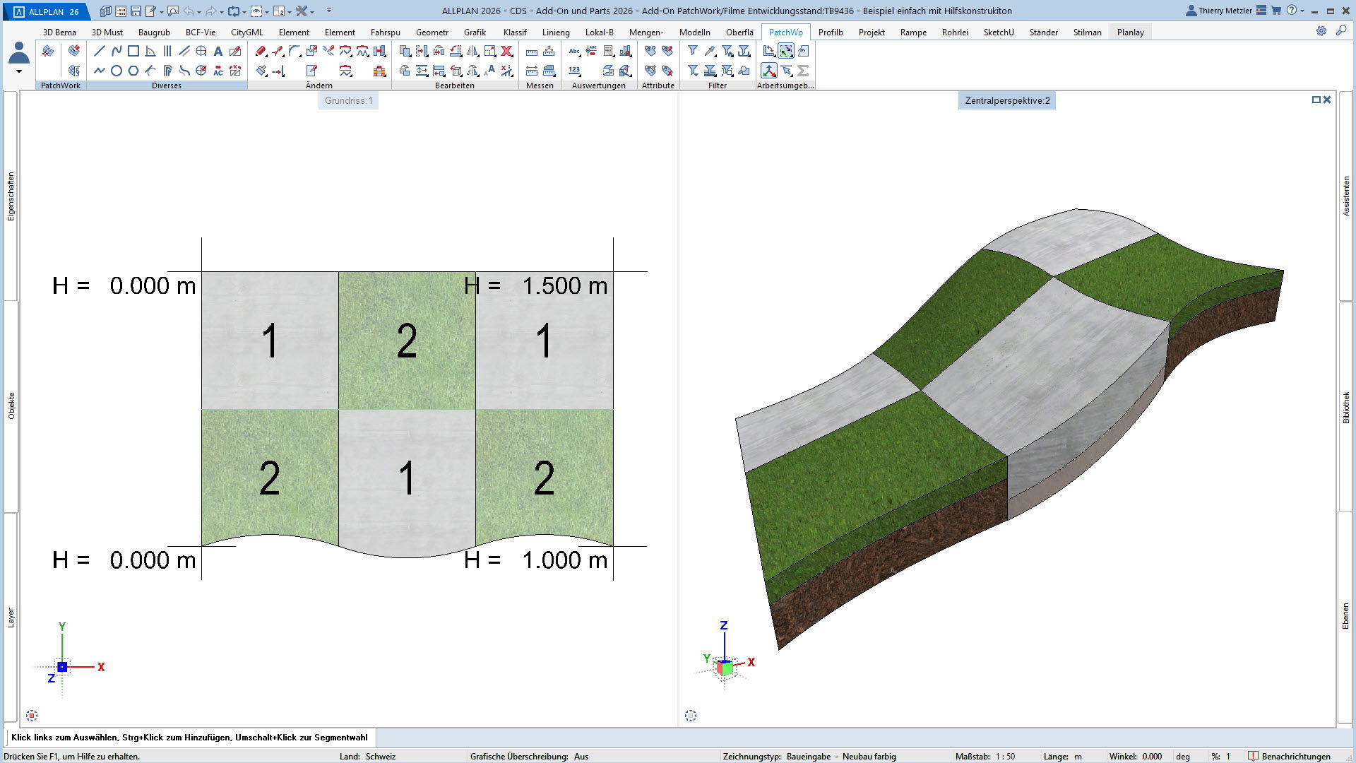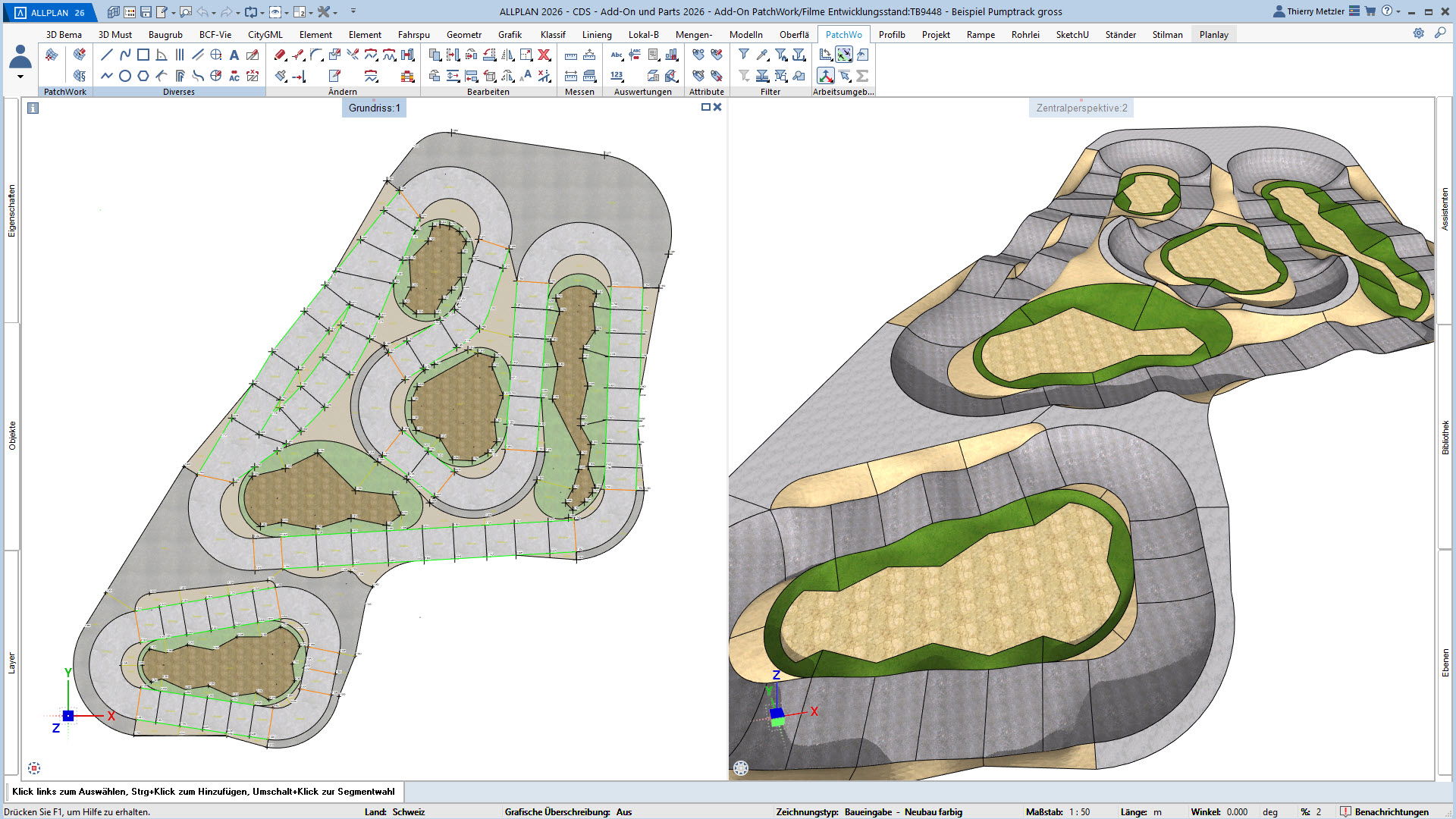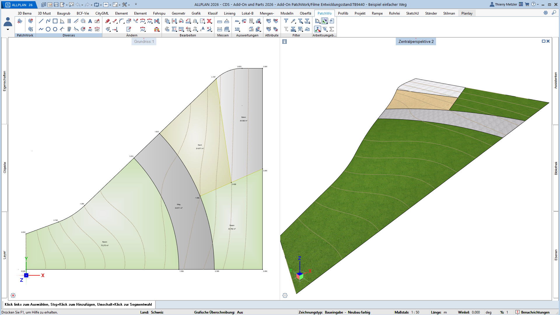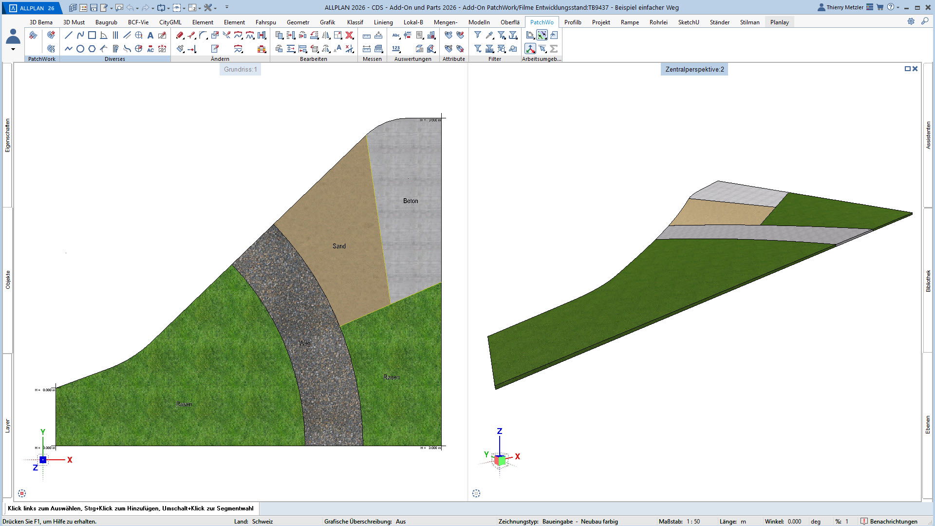 Der innovative Workflow ermöglicht die Geometrieerzeugung durch Punkte, Linien, Kreise, Splines und Kurven. In einem zweiten Schritt platzieren Sie Höhenpunkte an Eck- und Schnittpunkten, definieren Bereiche und weisen diesen verschiedene Materialstile zu – zum Beispiel Asphalt, Beton, Platten, Sand oder Rasen. PatchWork generiert daraus perfekte 2D-Darstellungen und 3D-Volumen, die aus mehreren Materialschichten bestehen können.