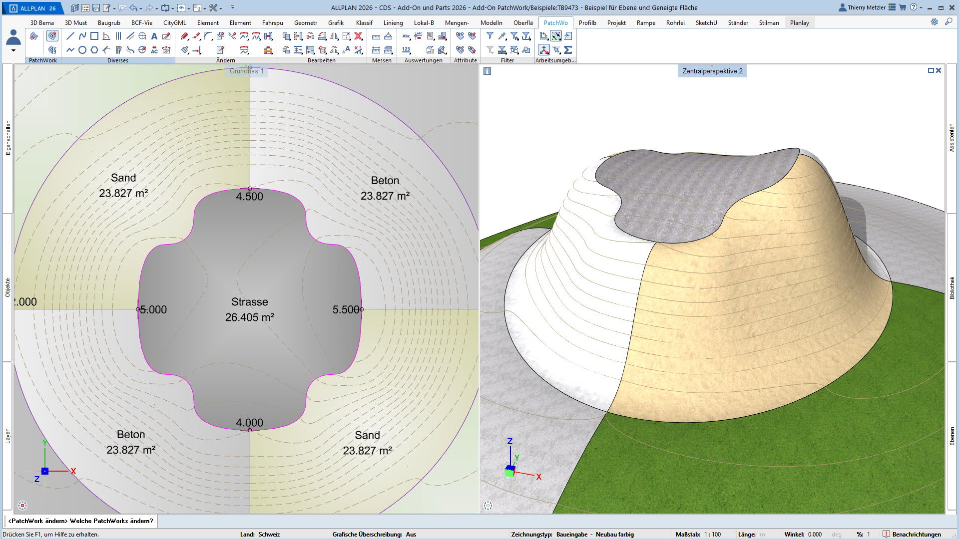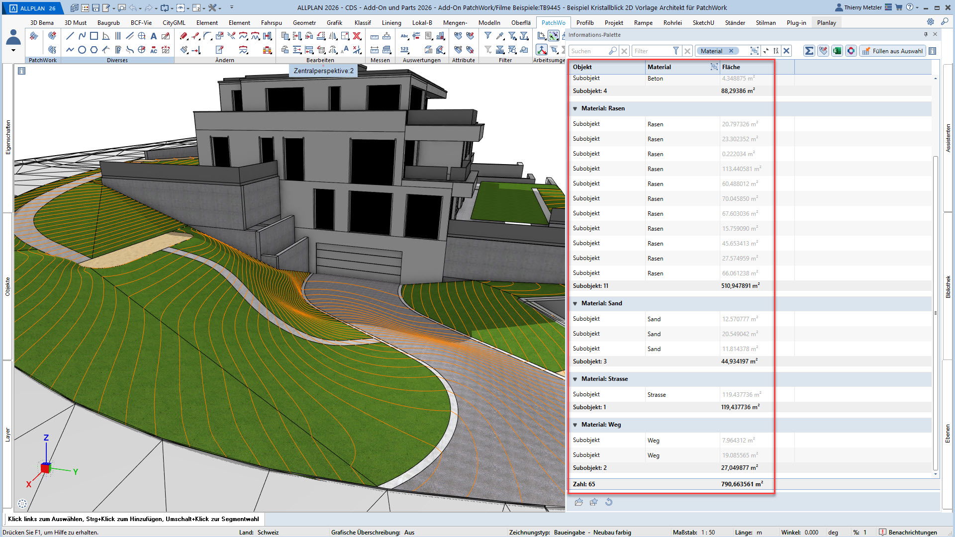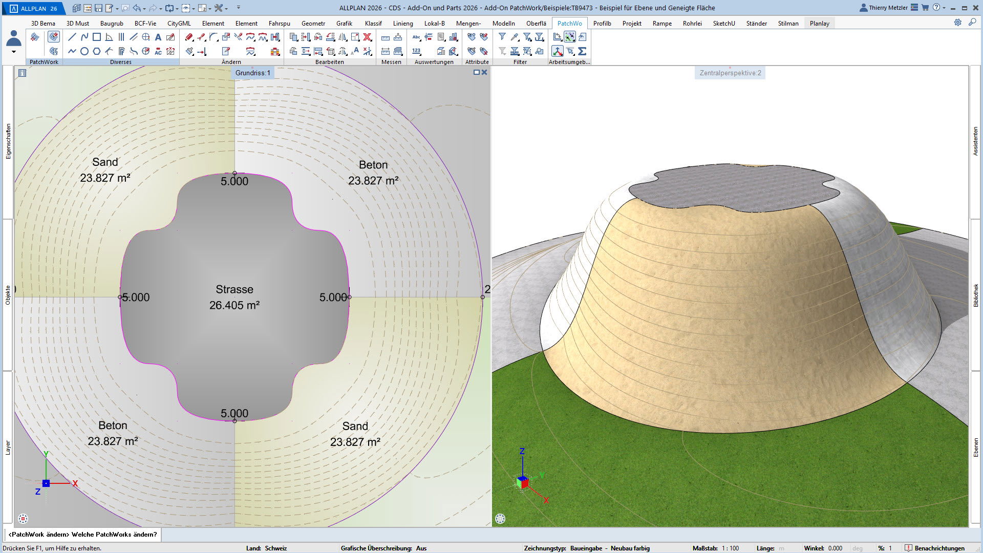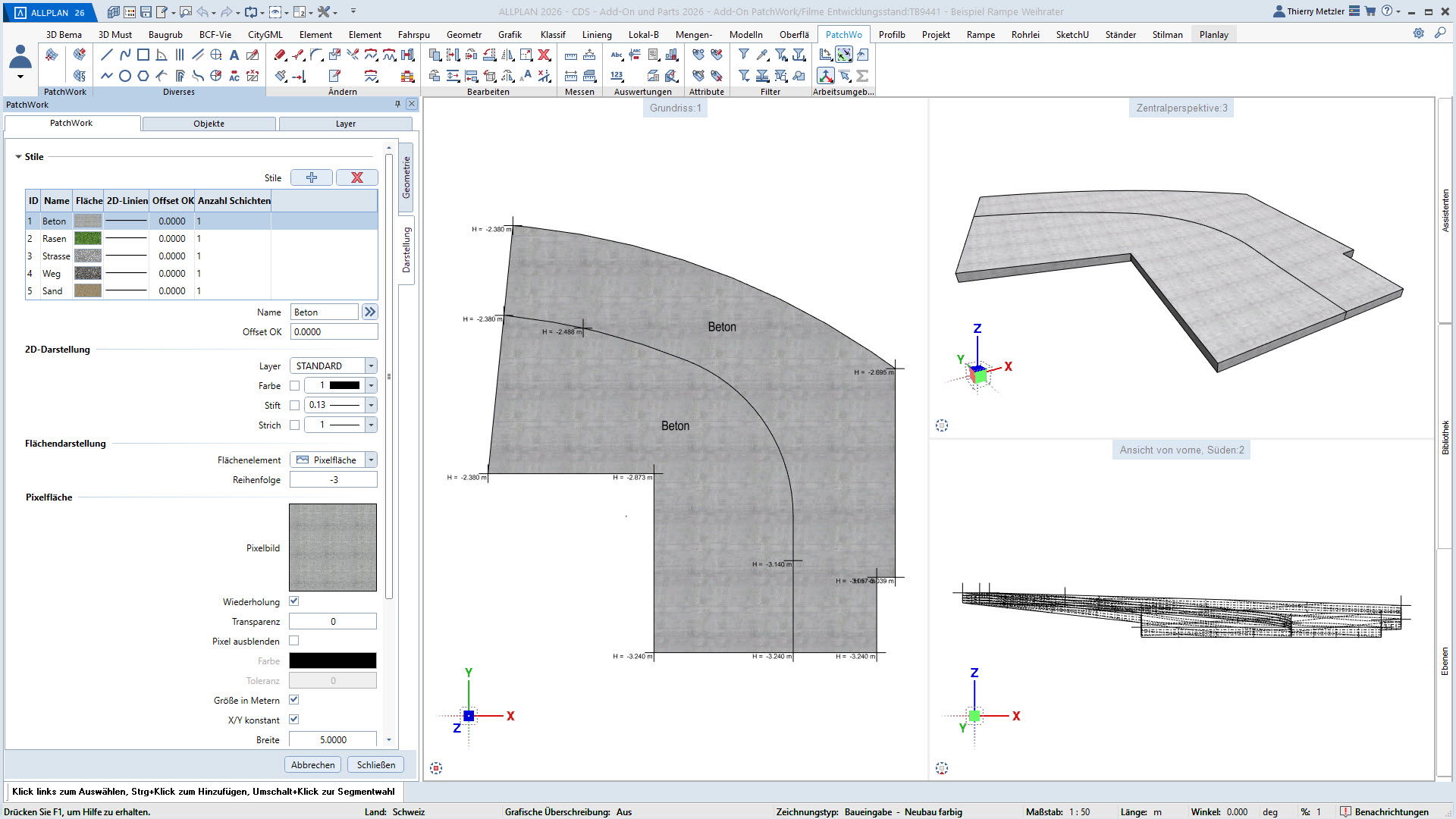 Der innovative Workflow ermöglicht die Geometrieerzeugung durch Punkte, Linien, Kreise, Splines und Kurven. In einem zweiten Schritt platzieren Sie Höhenpunkte an Eck- und Schnittpunkten, definieren Bereiche und weisen diesen verschiedene Materialstile zu – zum Beispiel Asphalt, Beton, Platten, Sand oder Rasen. PatchWork generiert daraus perfekte 2D-Darstellungen und 3D-Volumen, die aus mehreren Materialschichten bestehen können.