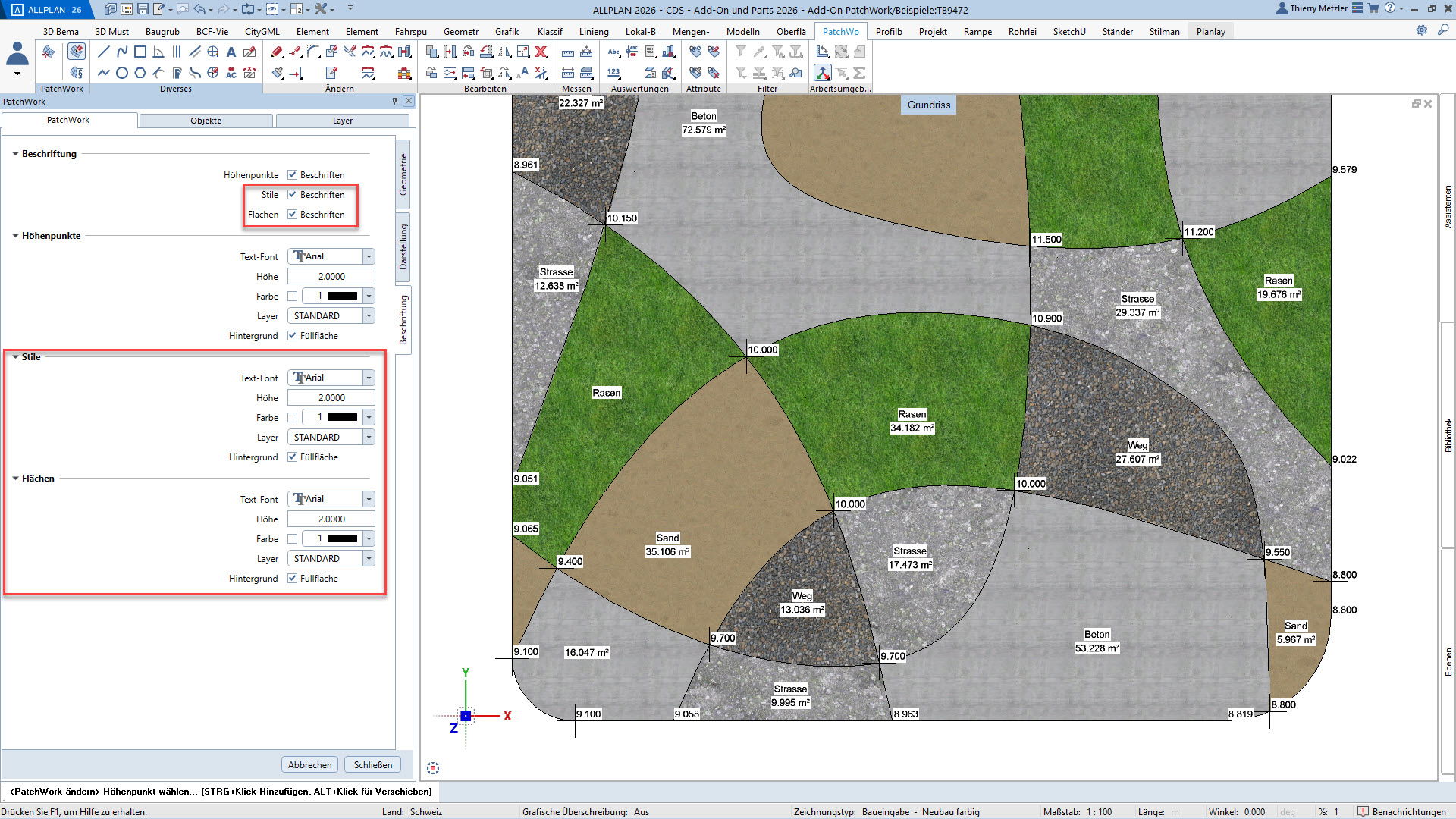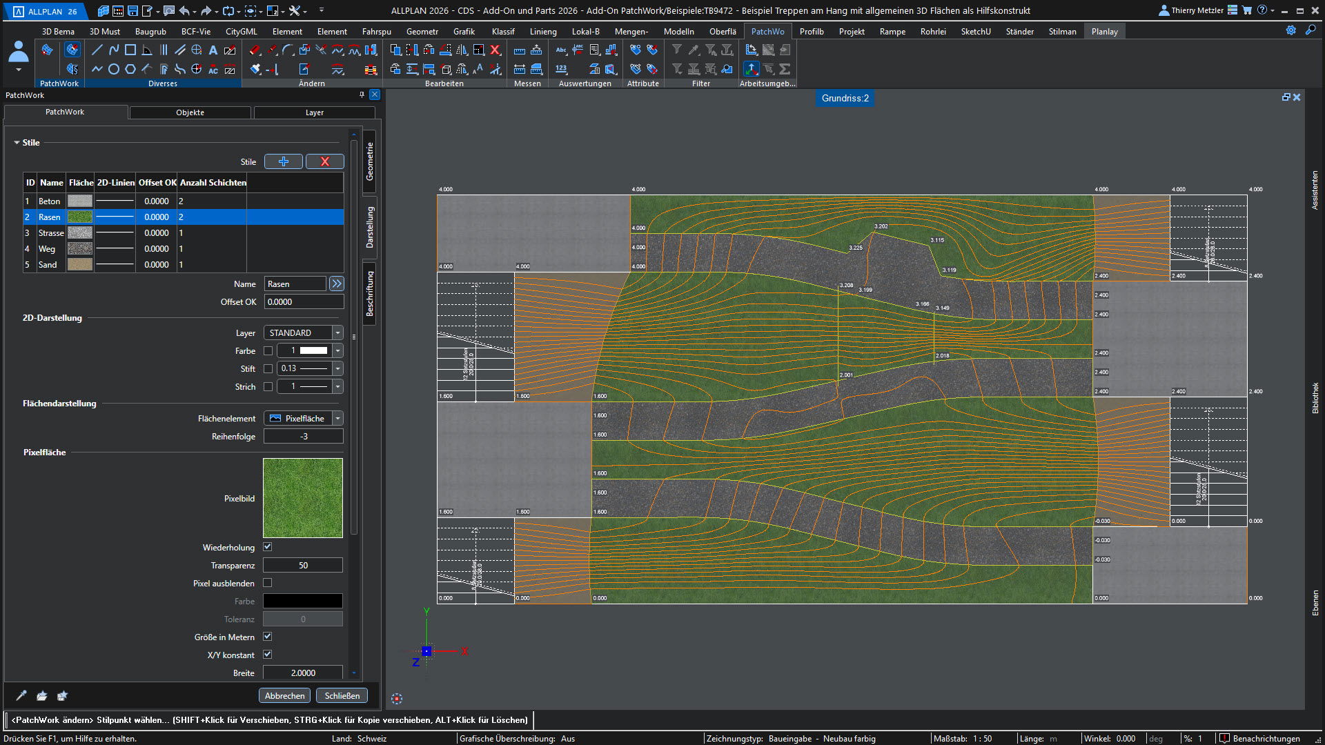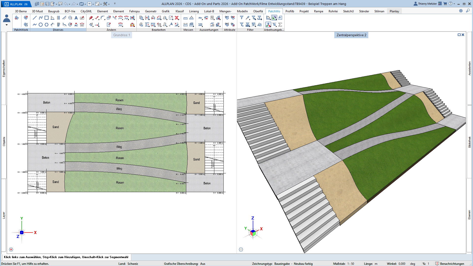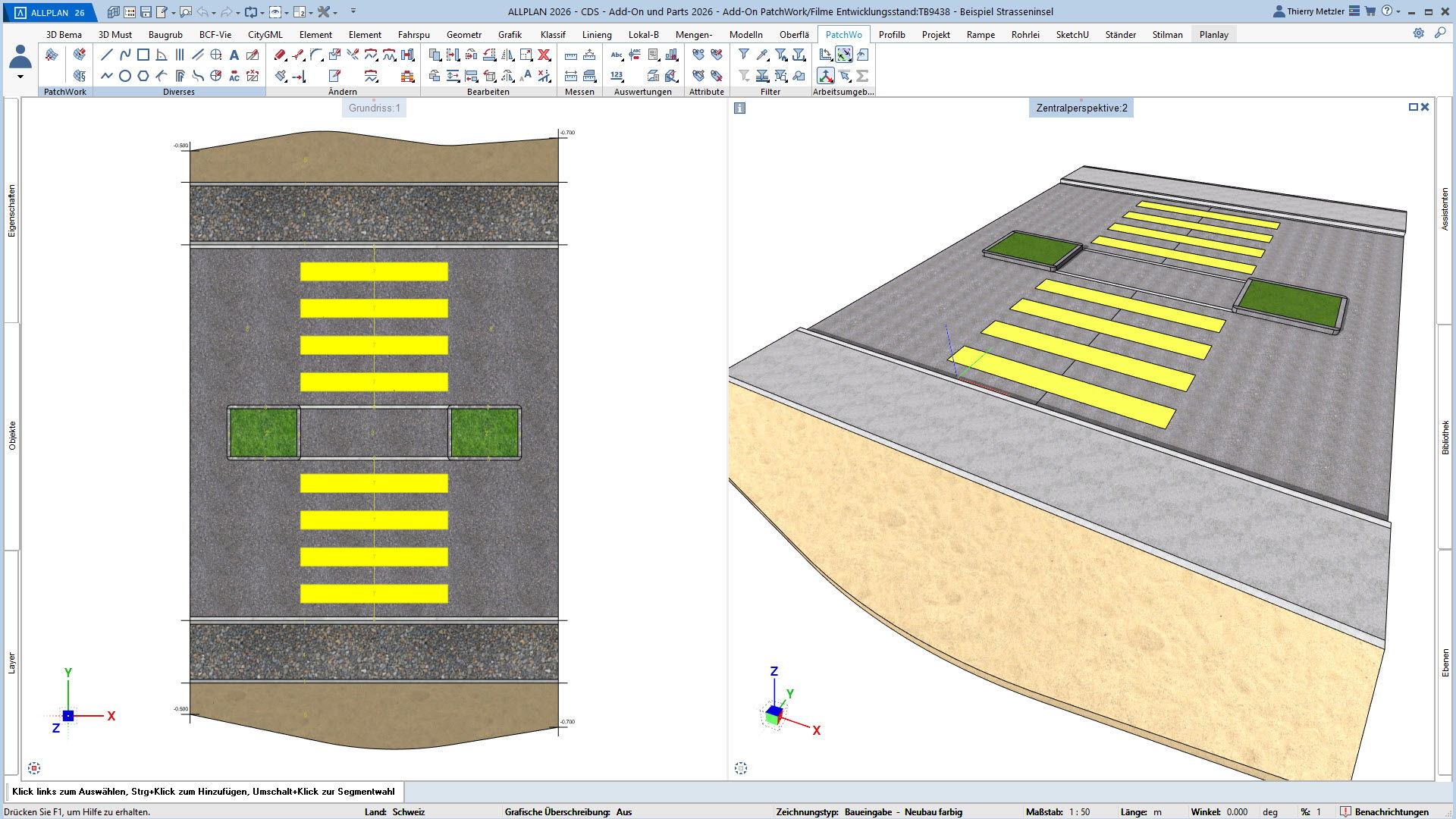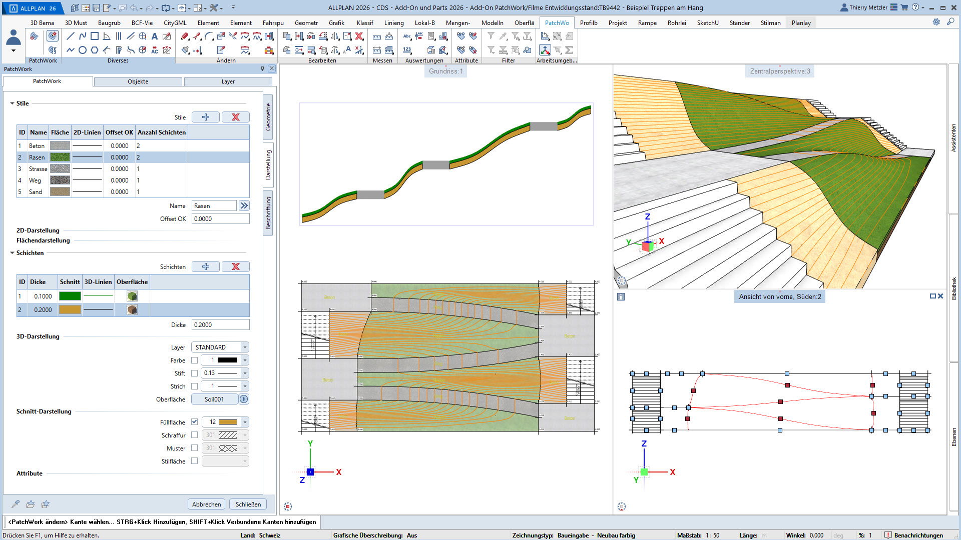 Der innovative Workflow ermöglicht die Geometrieerzeugung durch Punkte, Linien, Kreise, Splines und Kurven. In einem zweiten Schritt platzieren Sie Höhenpunkte an Eck- und Schnittpunkten, definieren Bereiche und weisen diesen verschiedene Materialstile zu – zum Beispiel Asphalt, Beton, Platten, Sand oder Rasen. PatchWork generiert daraus perfekte 2D-Darstellungen und 3D-Volumen, die aus mehreren Materialschichten bestehen können.