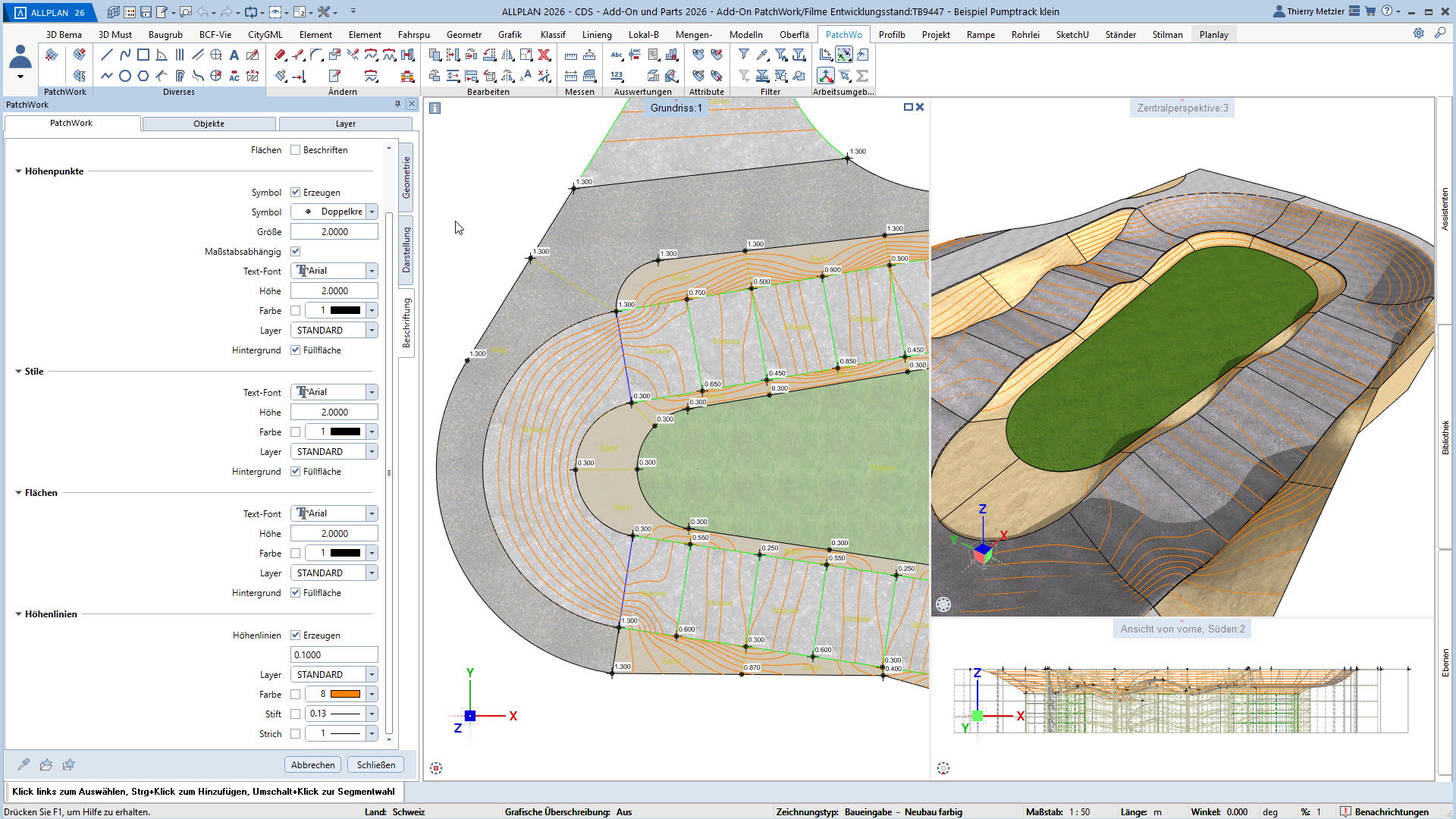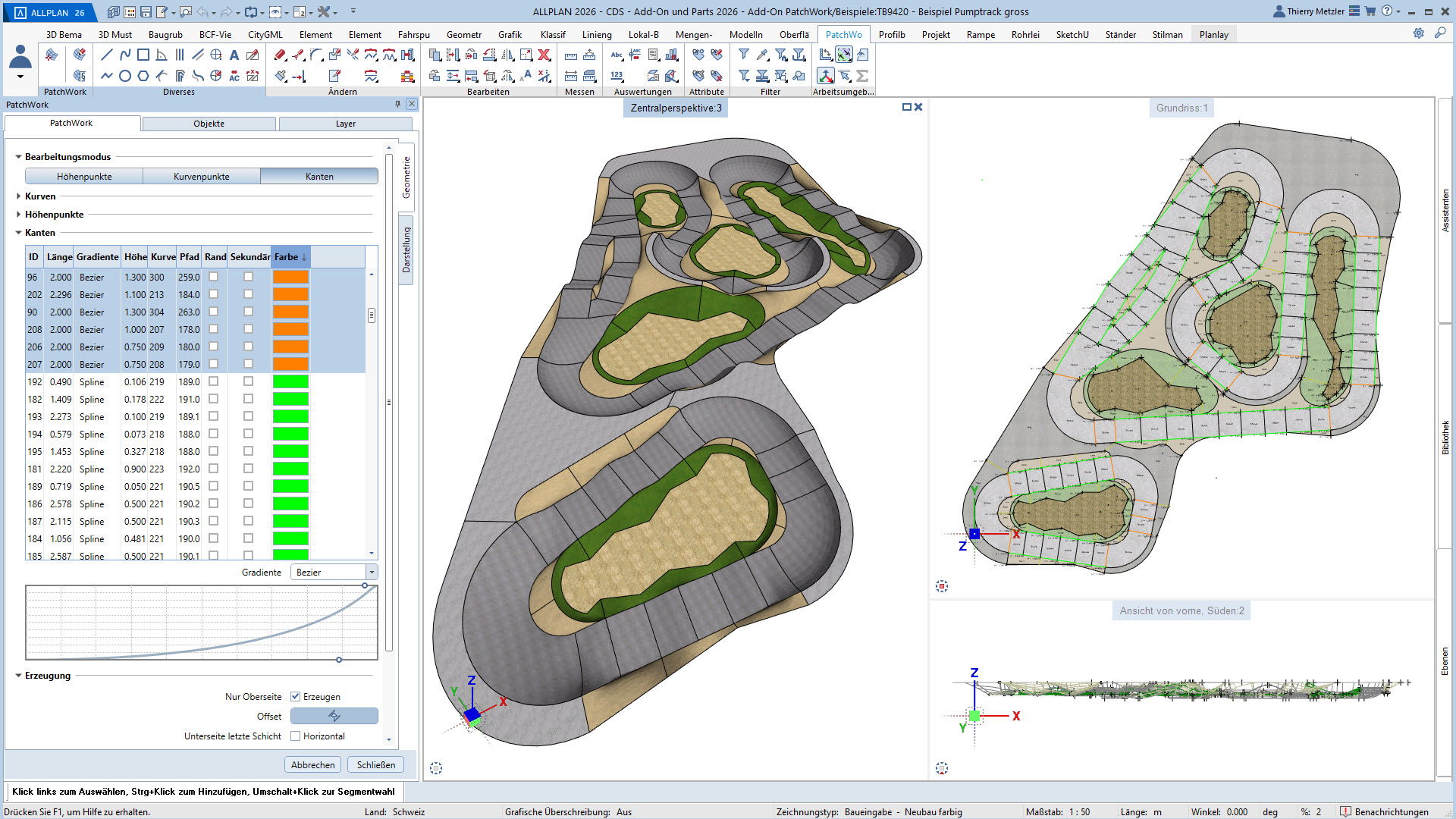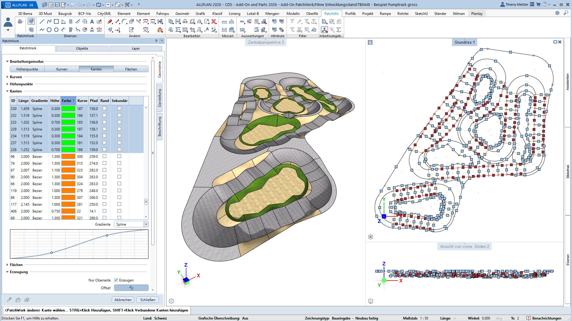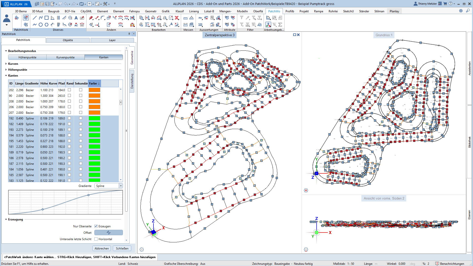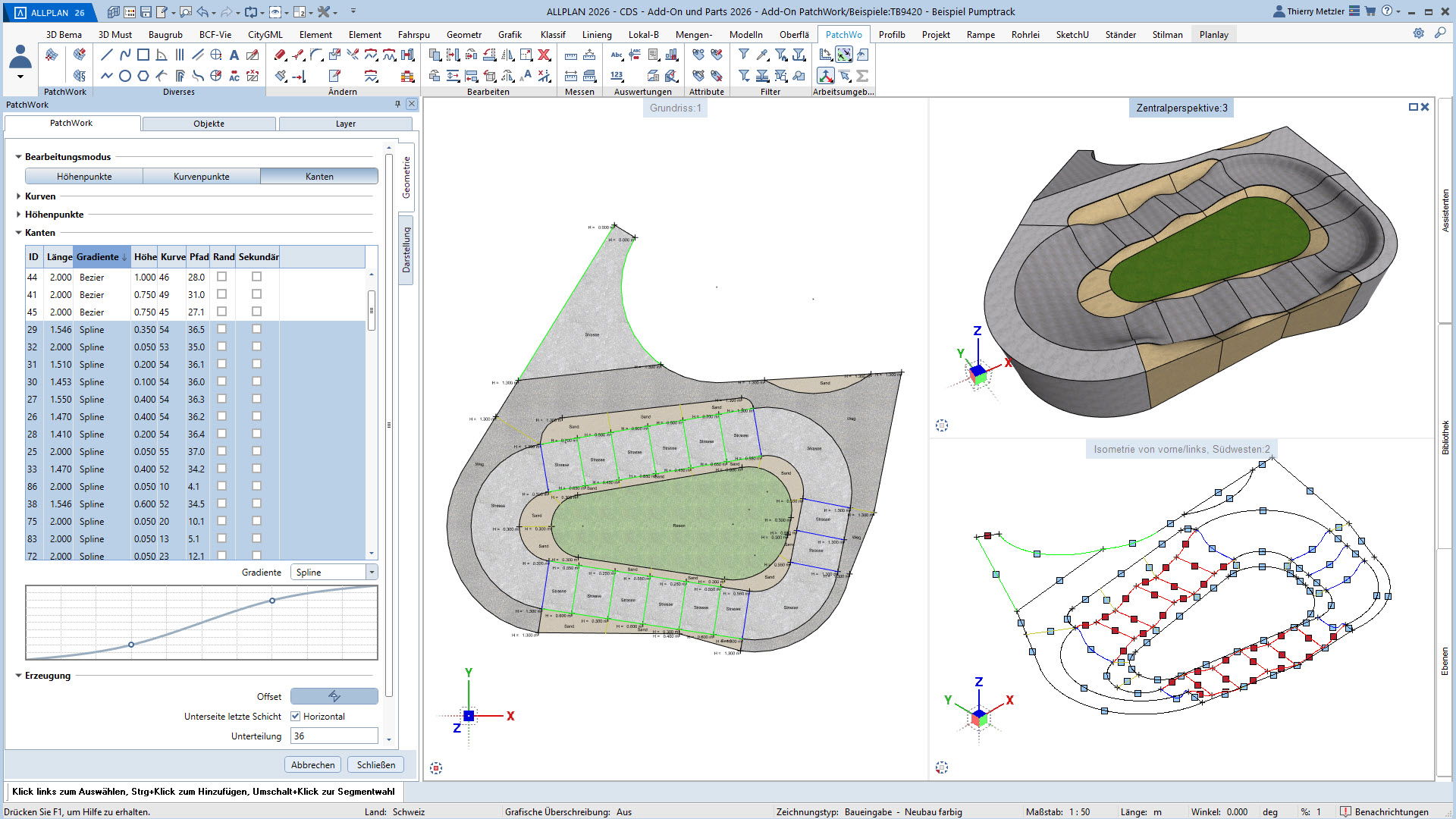Alle Punkte, Linien und Kurven sind jederzeit anpassbar – Längenprofile, Flächen und Volumina lassen sich in jeder Planungsphase flexibel verändern. Und das alles über eine übersichtliche Palette, ohne Spezialwissen oder Programmierkenntnisse.
