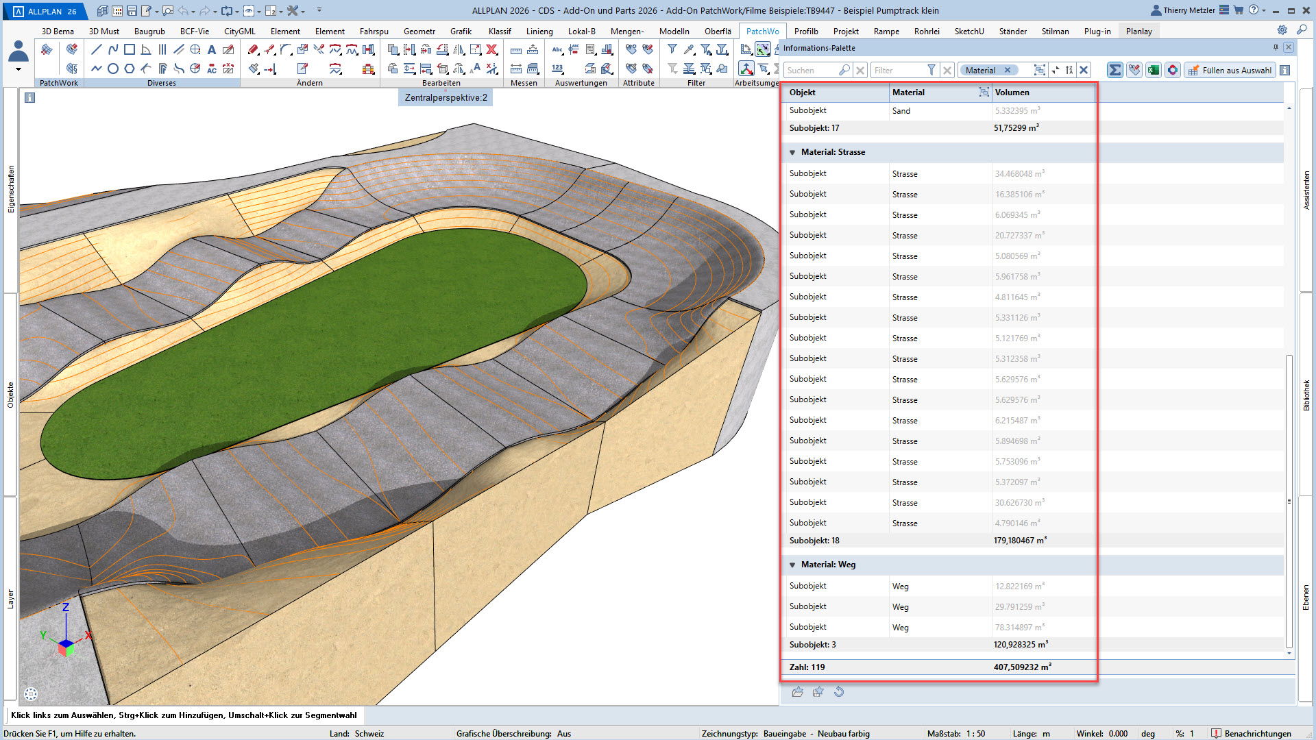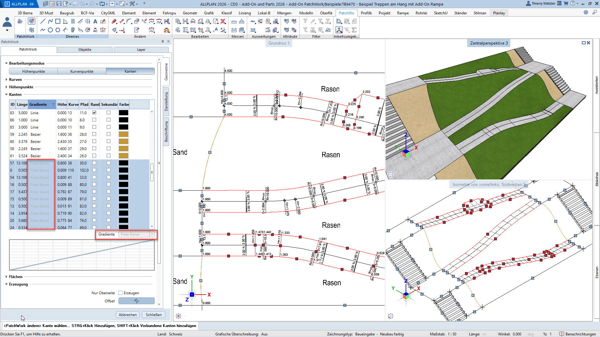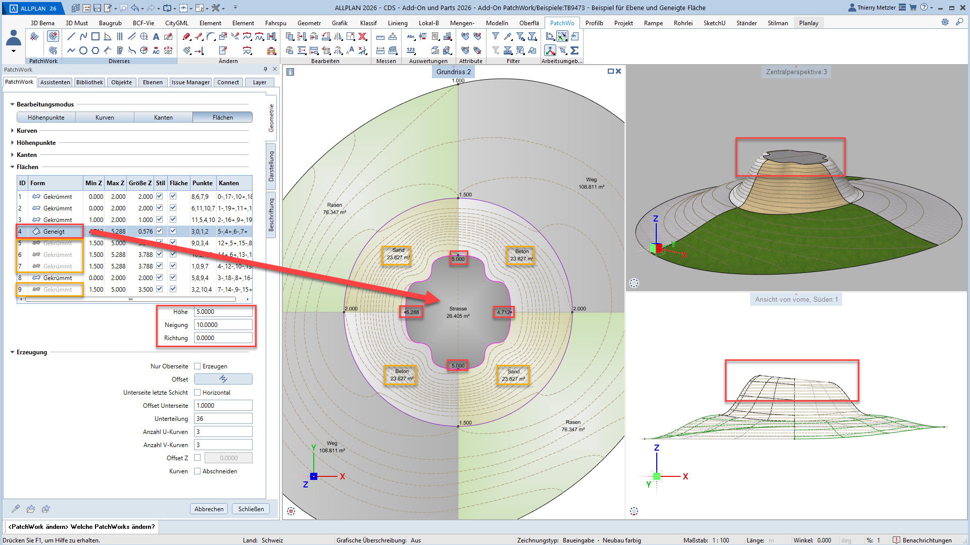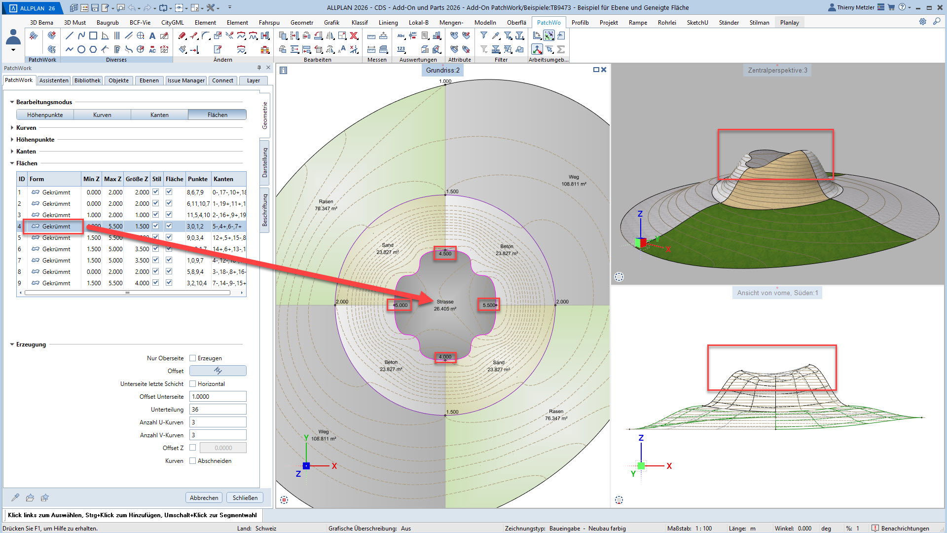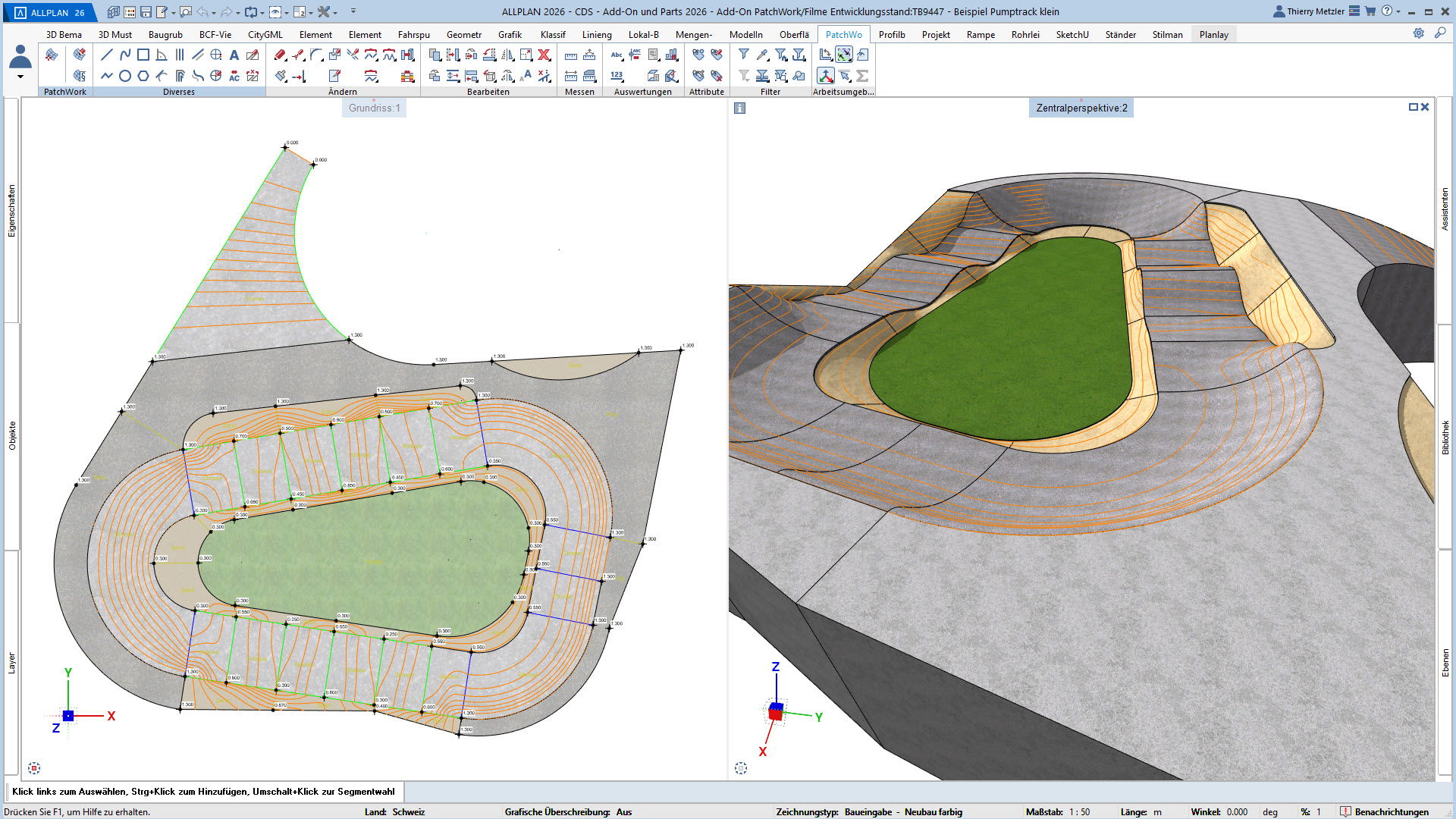 Alle Punkte, Linien und Kurven sind jederzeit anpassbar – Längenprofile, Flächen und Volumina lassen sich in jeder Planungsphase flexibel verändern. Und das alles über eine übersichtliche Palette, ohne Spezialwissen oder Programmierkenntnisse.
