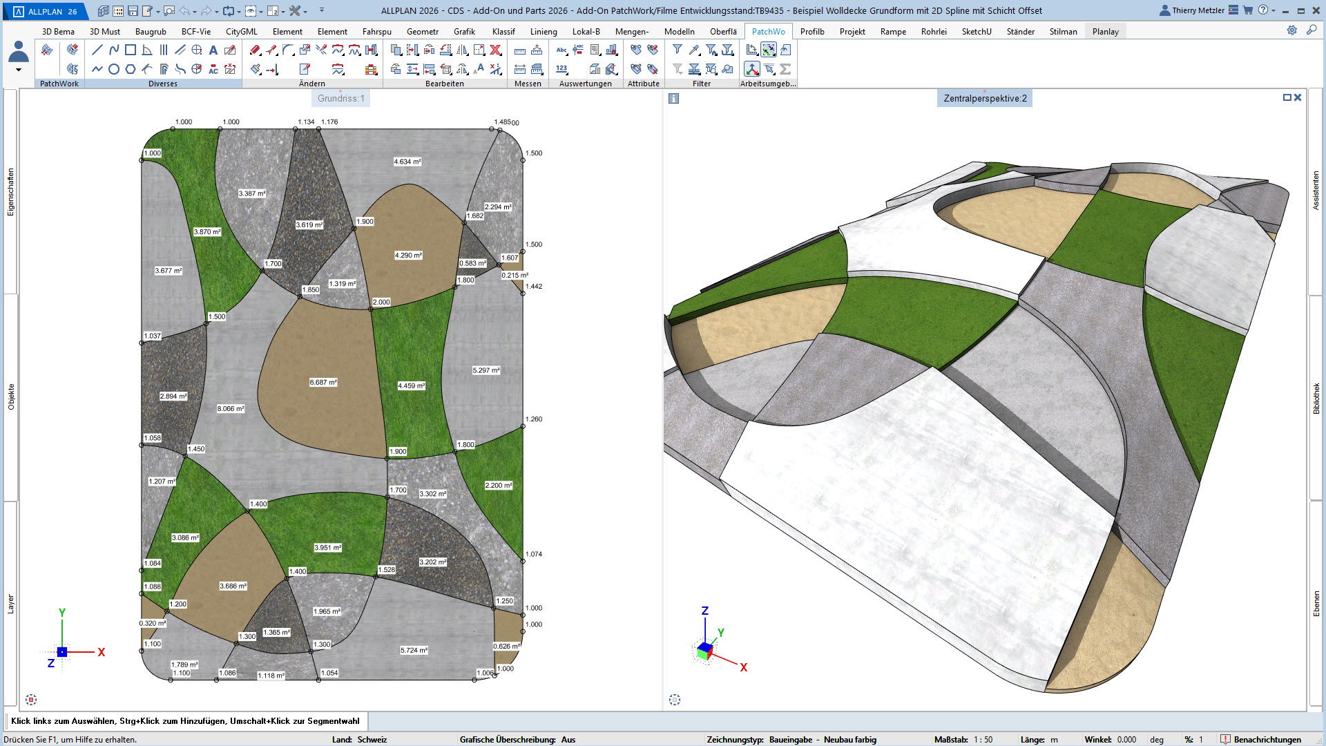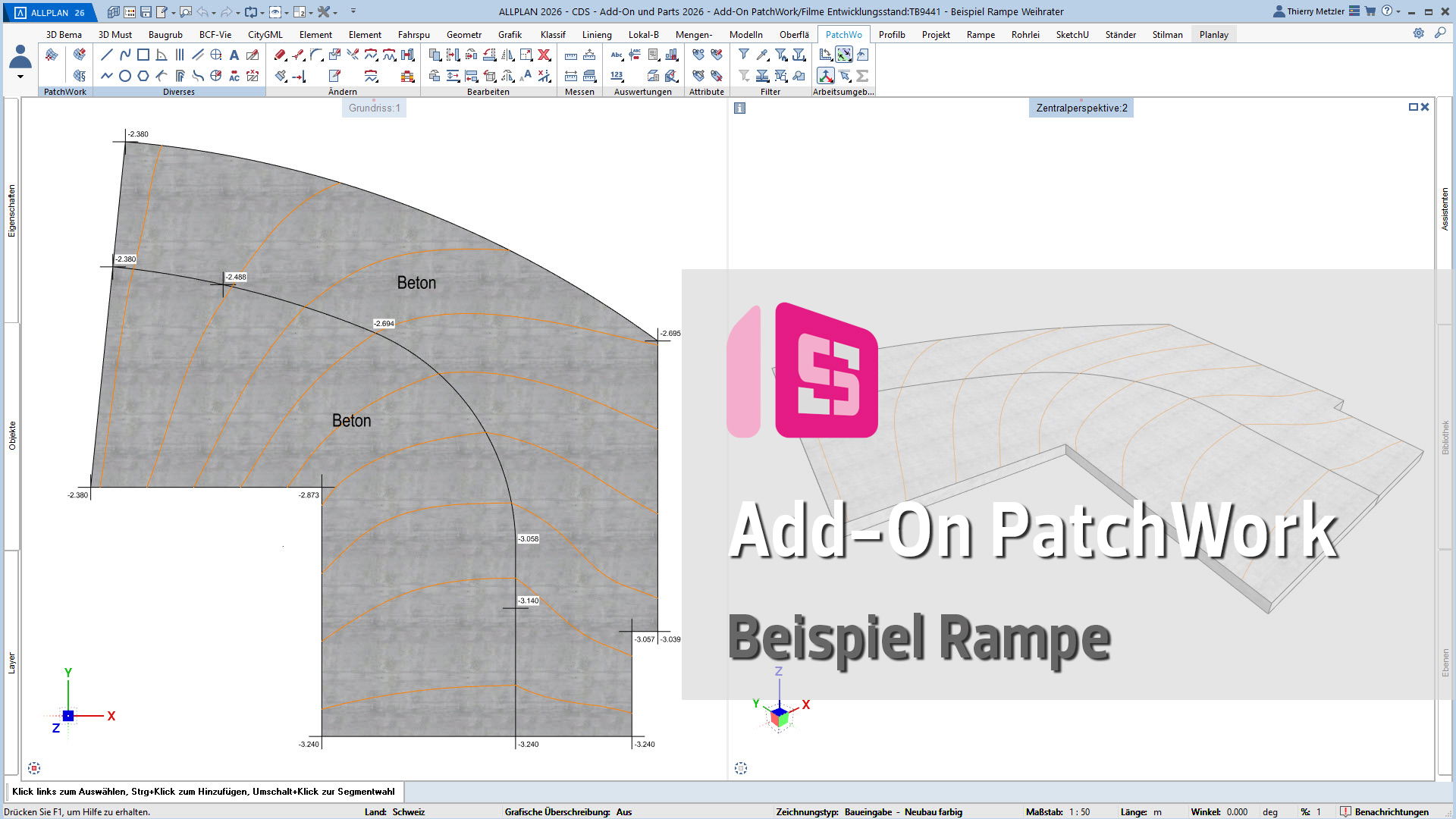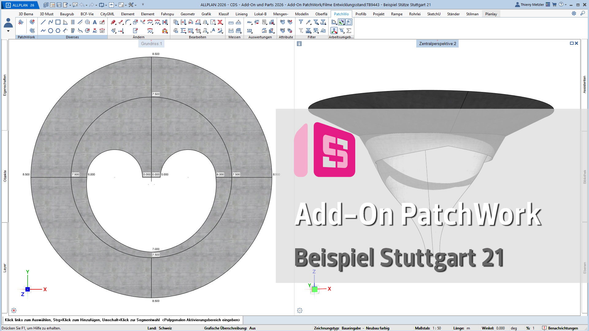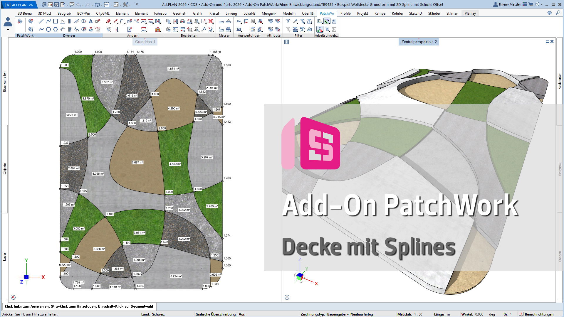 Mit dem ALLPLAN Add-On PatchWork erstellen Sie gekurvte und runde 2D- und 3D-Geometrien – intuitiv, flexibel und effizient. Egal, ob Sie 2D-Grundrisse entwerfen, komplexe 3D-Freiformbauteile wie Tragwerksstürze und Dächer modellieren oder Umgebungs- und Freiraumplanungen um Ihr Bauvorhaben umsetzen: PatchWork integriert sich nahtlos in Ihren Workflow.