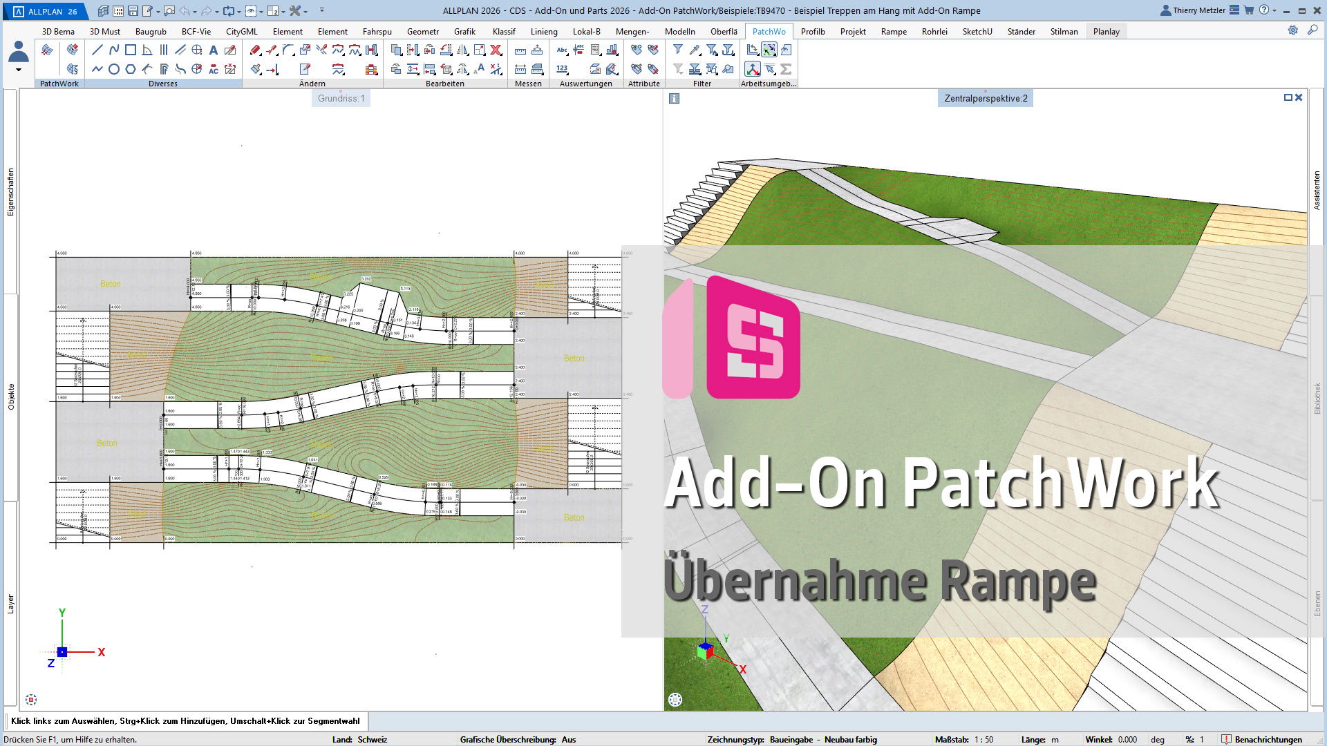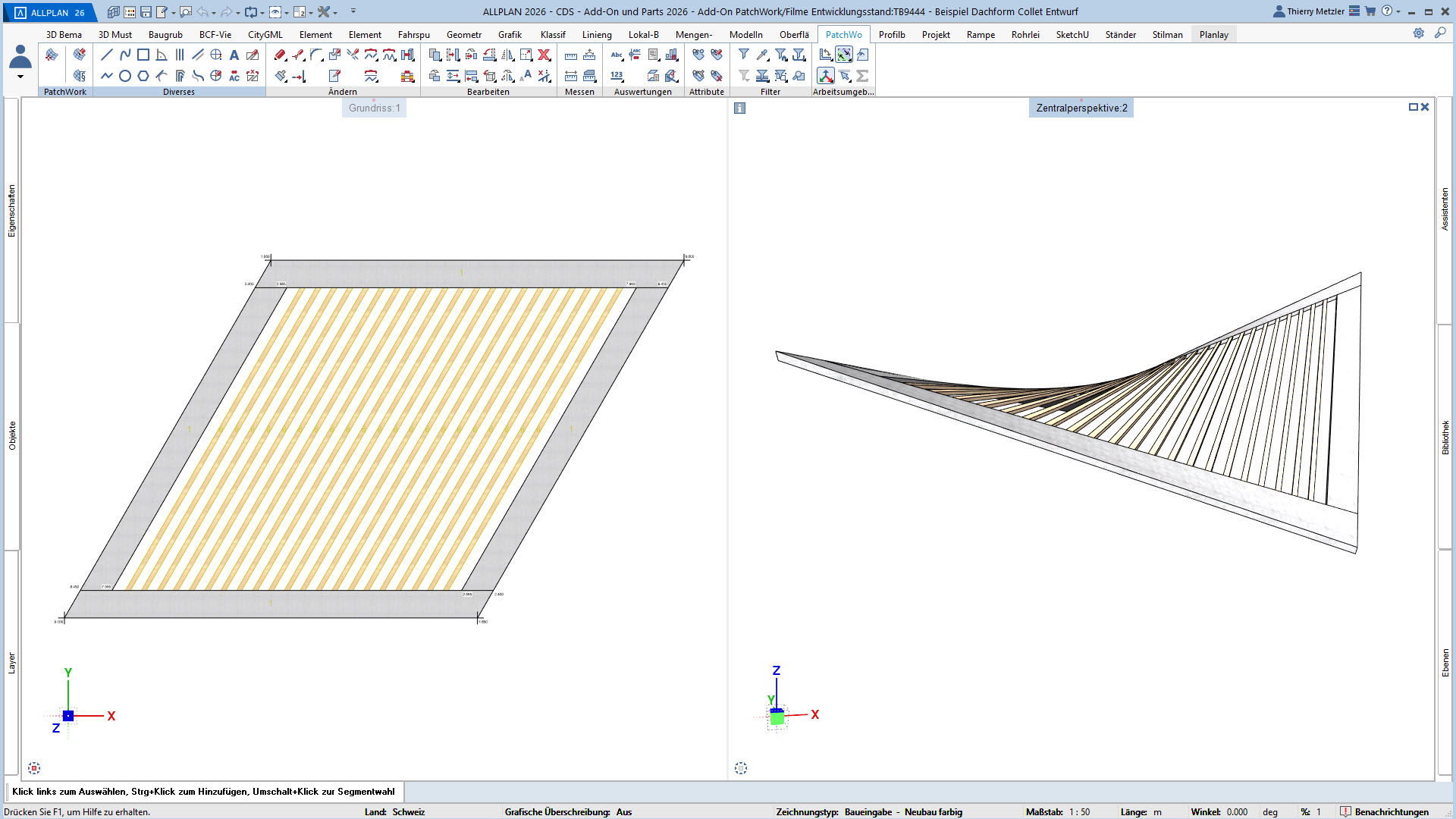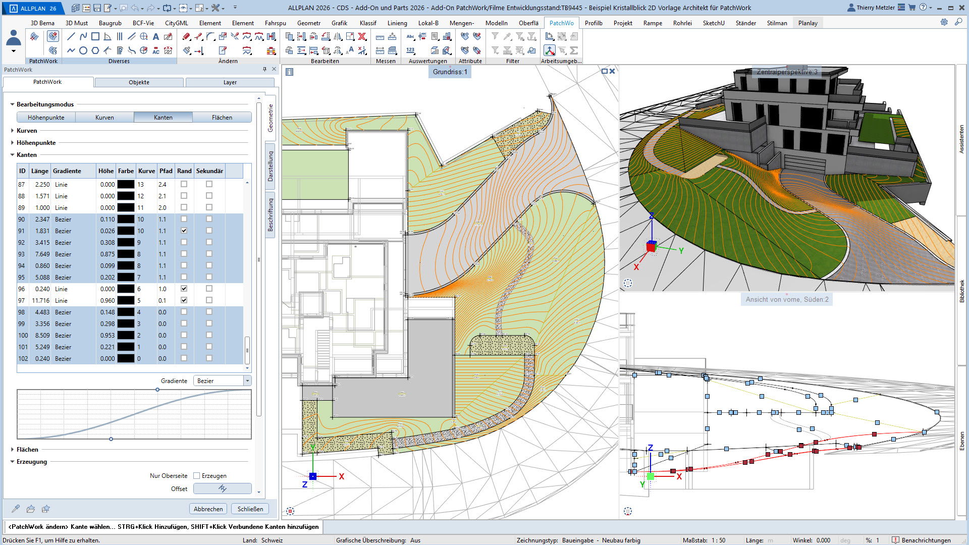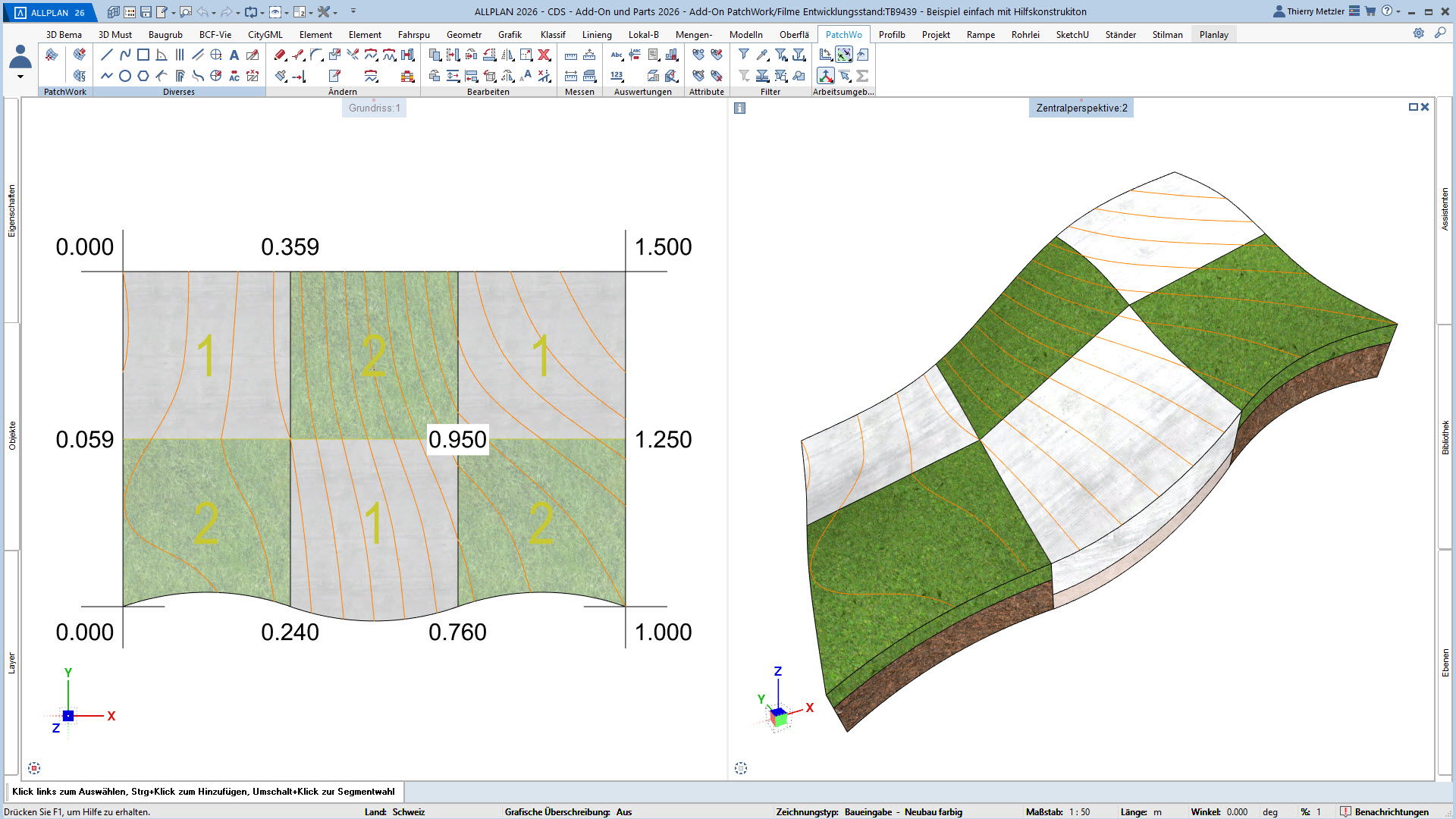Mit dem ALLPLAN Add-On PatchWork erstellen Sie gekurvte und runde 2D- und 3D-Geometrien – intuitiv, flexibel und effizient. Egal, ob Sie 2D-Grundrisse entwerfen, komplexe 3D-Freiformbauteile wie Tragwerksstürze und Dächer modellieren oder Umgebungs- und Freiraumplanungen um Ihr Bauvorhaben umsetzen: PatchWork integriert sich nahtlos in Ihren Workflow.