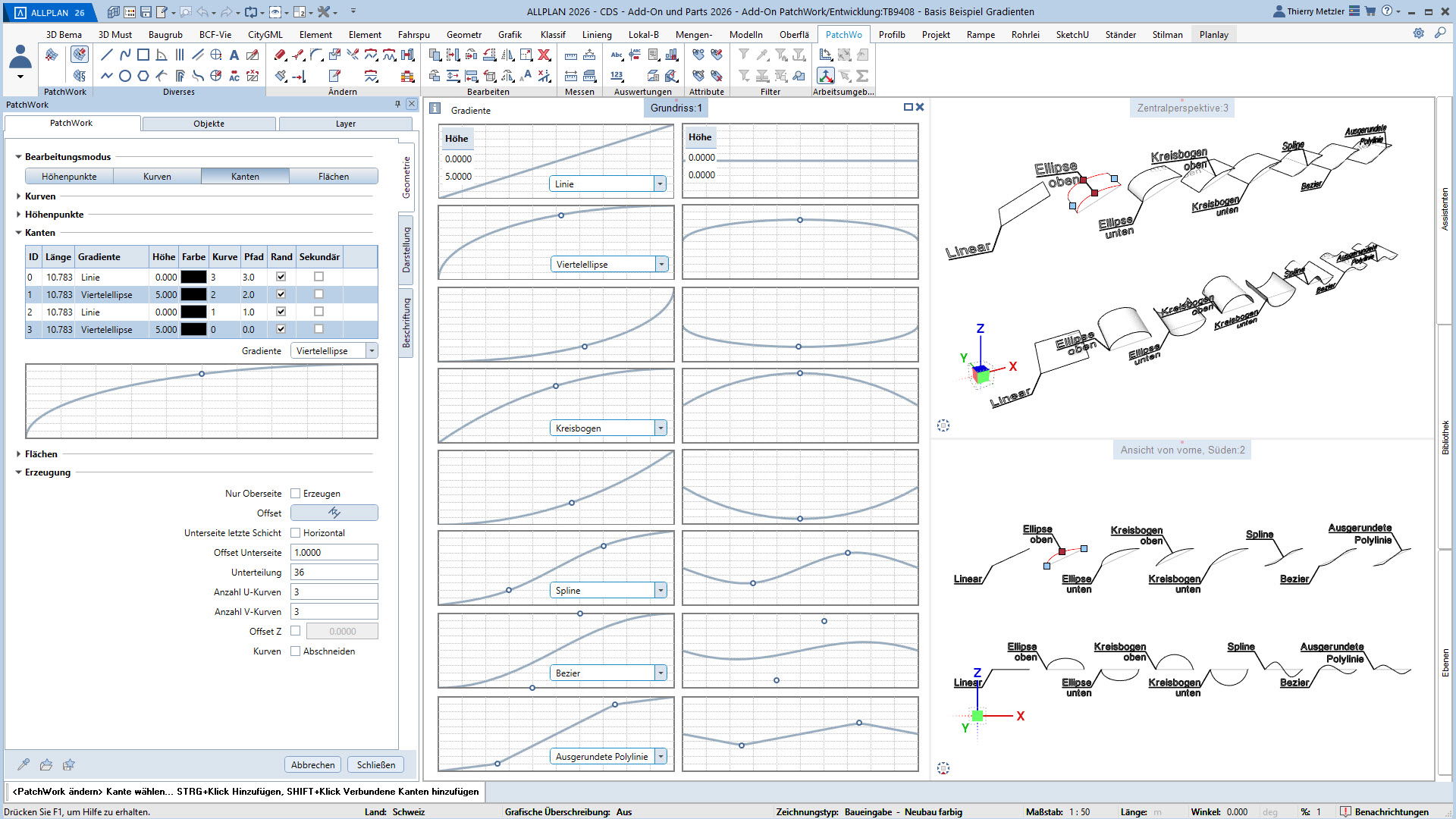 Kreisbögen und Viertelellipsen stufenlos von konkav bis konvex einstellbar, mit variabler Bogenhöhe und erweiterten Flächenmodifikatoren.